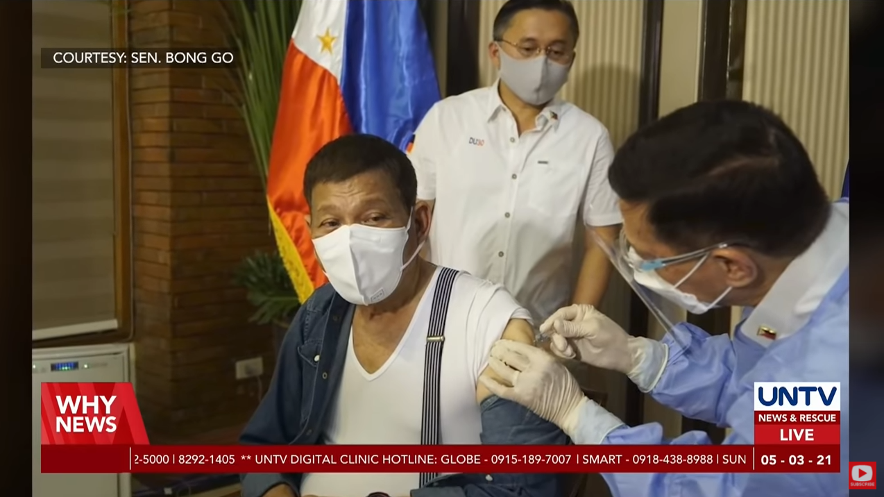 올해 2월 해리 로케 대통령 대변인은 두테르테 대통령이 중국의 시노팜 백신을 가장 선호한다(He has said that his preference is for Sinopharm)는 발언을 한 바 있다. 그리고 지난 5월 3일, 크리스토퍼 봉 고(Bong Go) 상원의원은 프란시스코 두케 보건부 장관이 두테르테 대통령에게 시노팜 백신 주사를 놓는 장면을 영상으로 찍어 페이스북에 올렸다. 하지만 시노팜이 필리핀 FDA의 긴급사용승인을 받은 것은 지난 6월 7일이었다. 대통령이 필리핀 FDA의 정식 사용승인을 받지 않은 백신을 공개적으로 접종한 셈이었다. 대통령이 필리핀 백신 규정을 어겼음에 논란이 일자 해리 로케 대통령 대변인은 필리핀 식약청(FDA)이 대통령 경호 인력에 대해 시노팜 백신을 사용할 수 있도록 동정적 사용 허가(compassionate use permit)를 한 바 있어 이 허가에 의해 해당 백신을 사용한 것이라고 해명했지만 대통령이 먼저 백신 접종 규정을 무시했다는 비난을 피하기는 어려웠다.