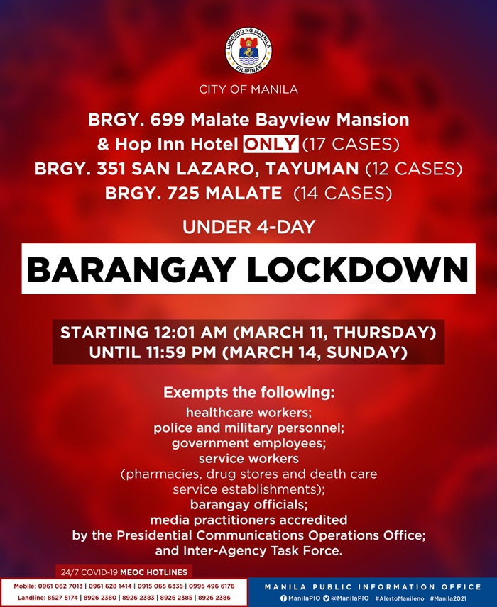 마닐라 시티, 말라테 베이뷰 맨션 등 일부 바랑가이 봉쇄 (3월 11일~14일)