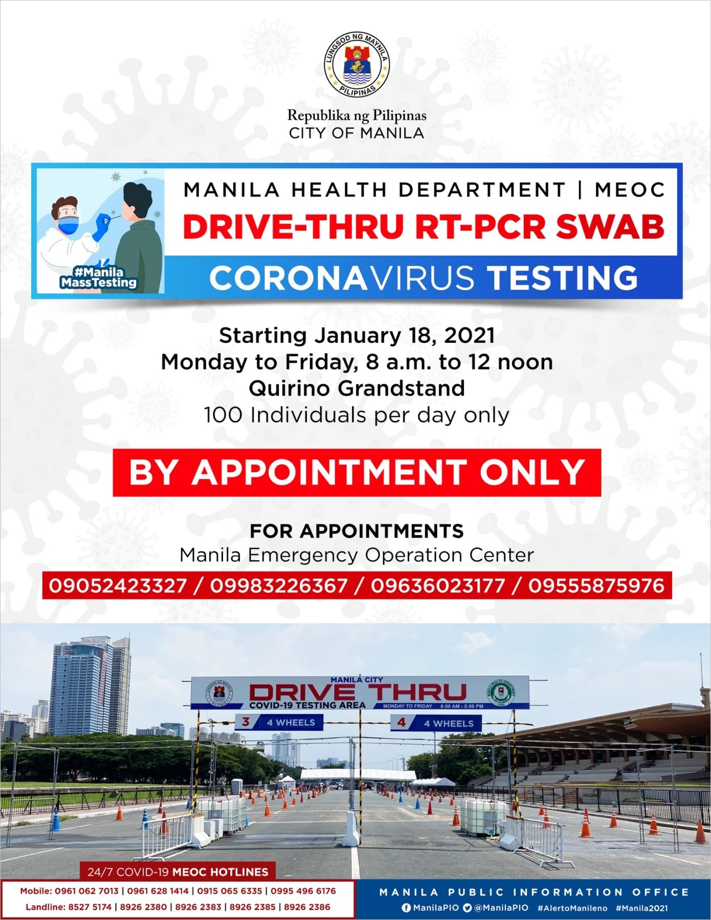· Manila launches free, by appointment only Covid-19 swab test at Quirino Grandstand