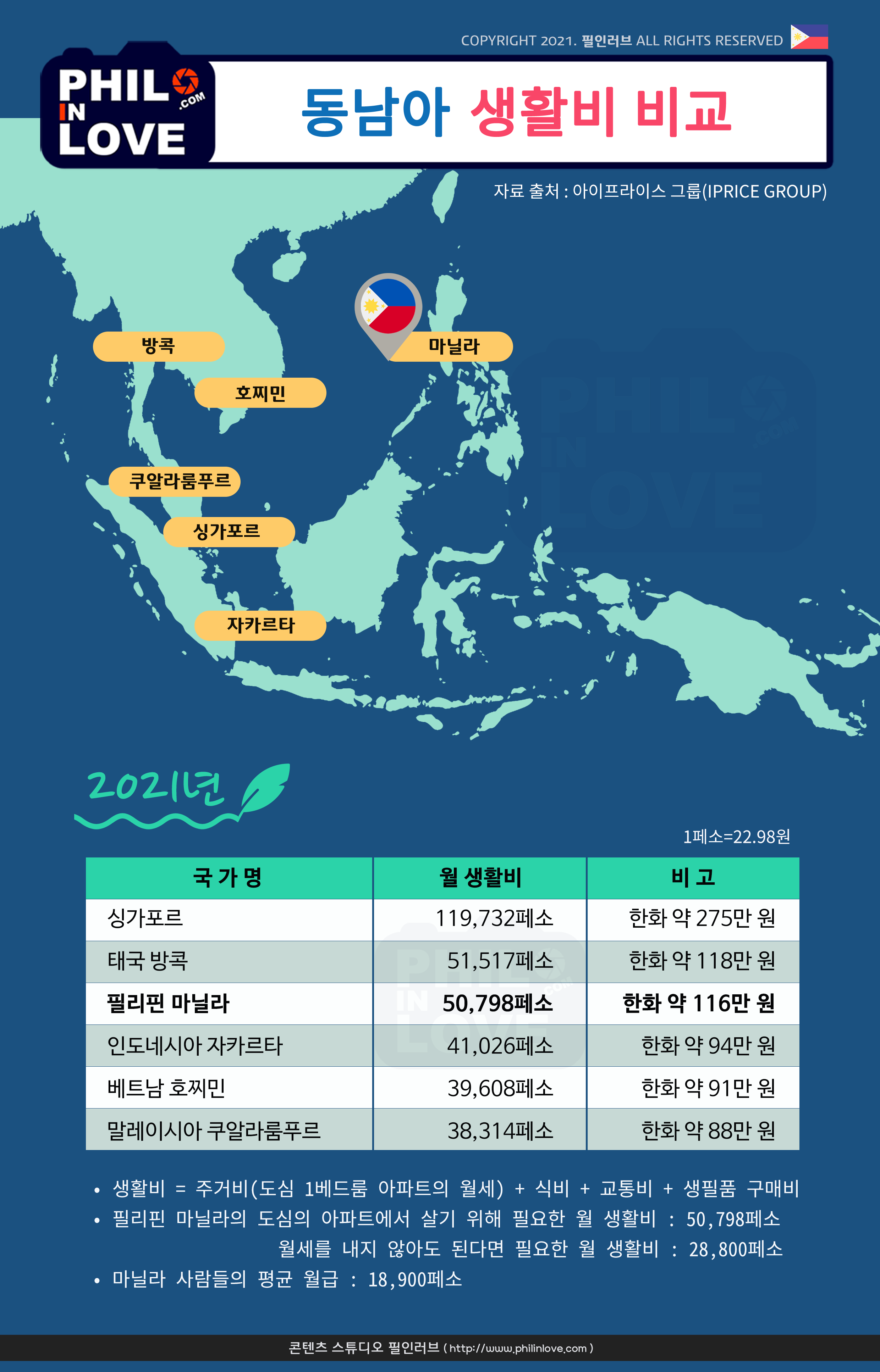일단 동남아시아에서 생활비가 가장 많이 드는 곳은 말레이반도 최남단에 있는 싱가포르이다. 싱가포르에서 살려면 월 생활비로 119,732페소(한화 약 274만 원)가 필요하다. 싱가포르 다음으로 생활비가 많이 드는 곳은 태국 방콕으로 방콕에서는 월 51,517페소(한화 약 118만 원)의 생활비가 필요하다. 방콕과 큰 차이는 없지만, 3위는 필리핀 마닐라이다. 필리핀 마닐라에 거주하는 사람이 필요한 돈은 50,798페소(한화 약 116만 원)로 방콕보다 약간 낮은 수준이다.