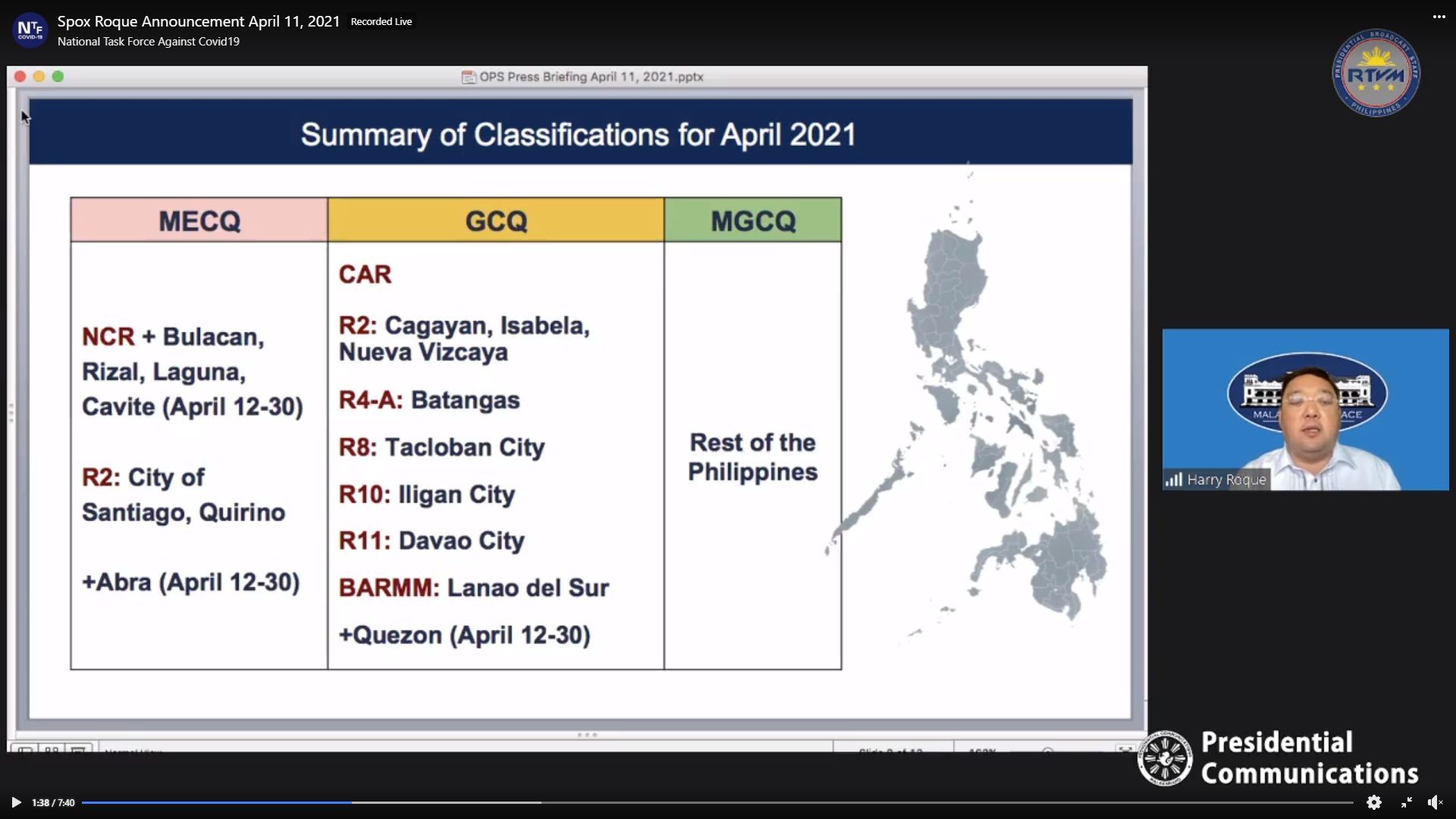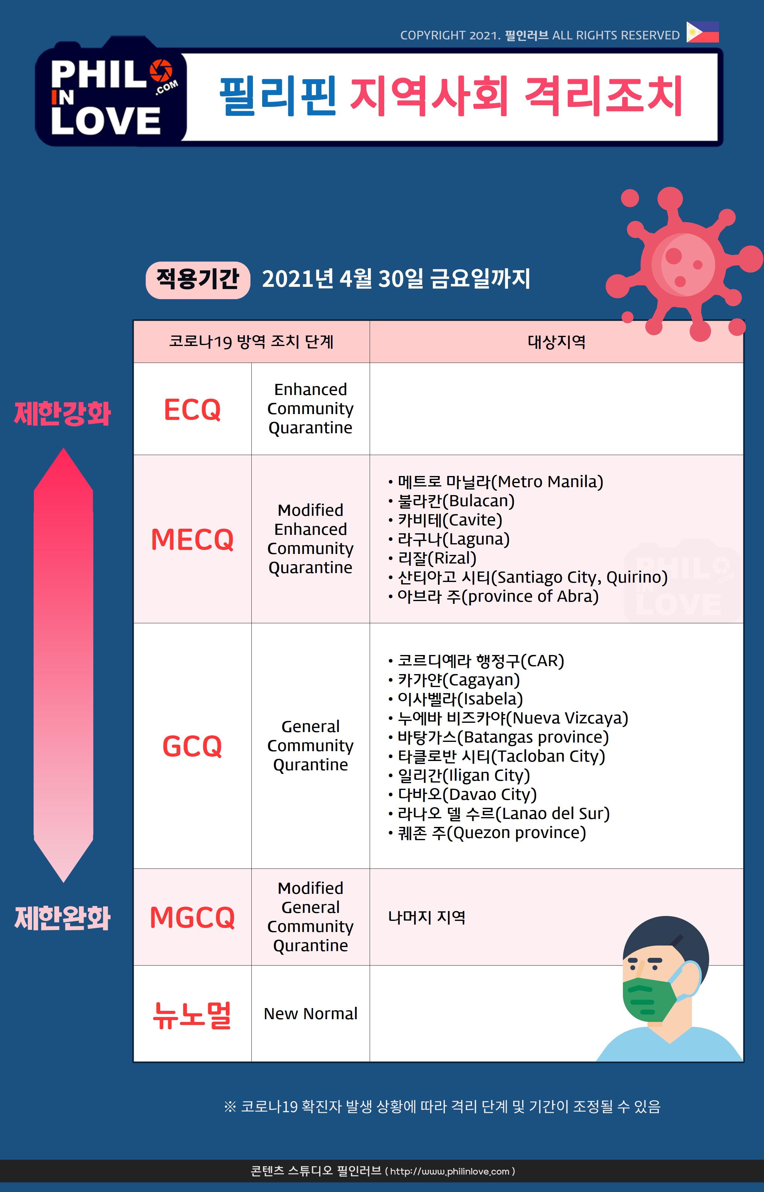 메트로 마닐라와 불라칸, 카비테, 라구나, 리잘 등 NCR-plus 지역의 코로나19 방역 조치 단계가 MECQ단계로 하향 조정되는 것으로 결정되었다. 산티아고 시티(Santiago City, Quirino)와 코르디예라 행정구 내에 있는 아브라 주(province of Abra)도 MECQ단계의 적용을 받는다. 이번 조치는 4월 30일까지 적용되며, 통금시간 유지 여부 및 ECQ와 MECQ의 차이에 대해서는 내일(4월 12일) 안내될 예정이라고 한다. 한편, 해리 로케 대통령 대변인은 두 번째로 코로나19에 감염된 상태로 이 소식을 전했다. 해리 로케 대통령 대변인은 지난 3월 15일 자신이 코로나19 확진 판정을 받았음을 발표한 바 있다. 코로나19에 감염되었다고 발표한 뒤 한 달도 되지 않아 다시 또 코로나19에 감염된 셈이다.