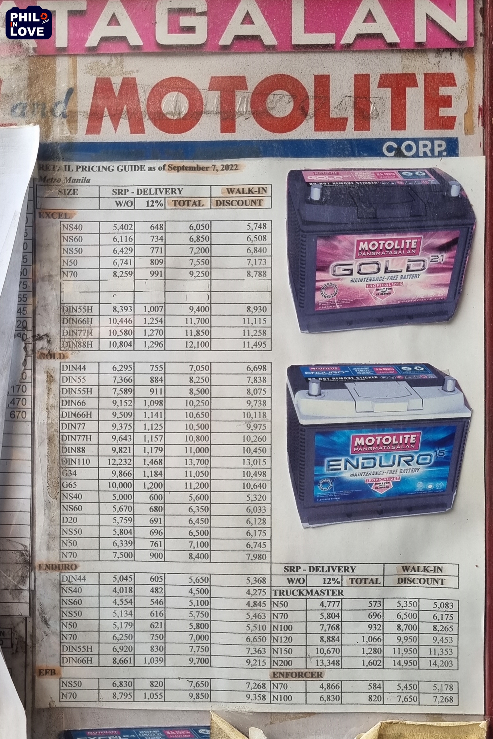 [필리핀 마닐라 생활] 모토라이트(Motolite) 차량용 자동차 배터리 가격 - 2024년