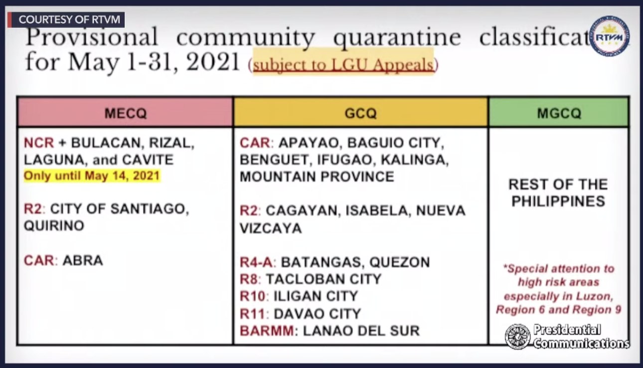 중환자실(ICU)의 부족 문제를 완화할 수 있다는 이유로 필리핀 보건부에서 NCR-plus 지역의 코로나19 방역 조치 단계를 1~2주 정도 MECQ로 연장하는 것을 제안하였다고 하더니, 5월 14일까지 메트로 마닐라와 불라칸, 카비테, 라구나, 리잘 등 NCR-plus 지역의 코로나19 방역 조치 단계가 MECQ단계로 계속 유지된다는 소식이다. 산티아고 시티와 아브라 주의 격리 단계도 변함없이 MECQ단계가 적용된다. 5월이 되었다고 크게 바뀌는 것은 없지만, 메트로 마닐라 지역 내 야간 통행 금지 시간이 오후 10시부터 오전 4시까지로 조정될 예정이다.