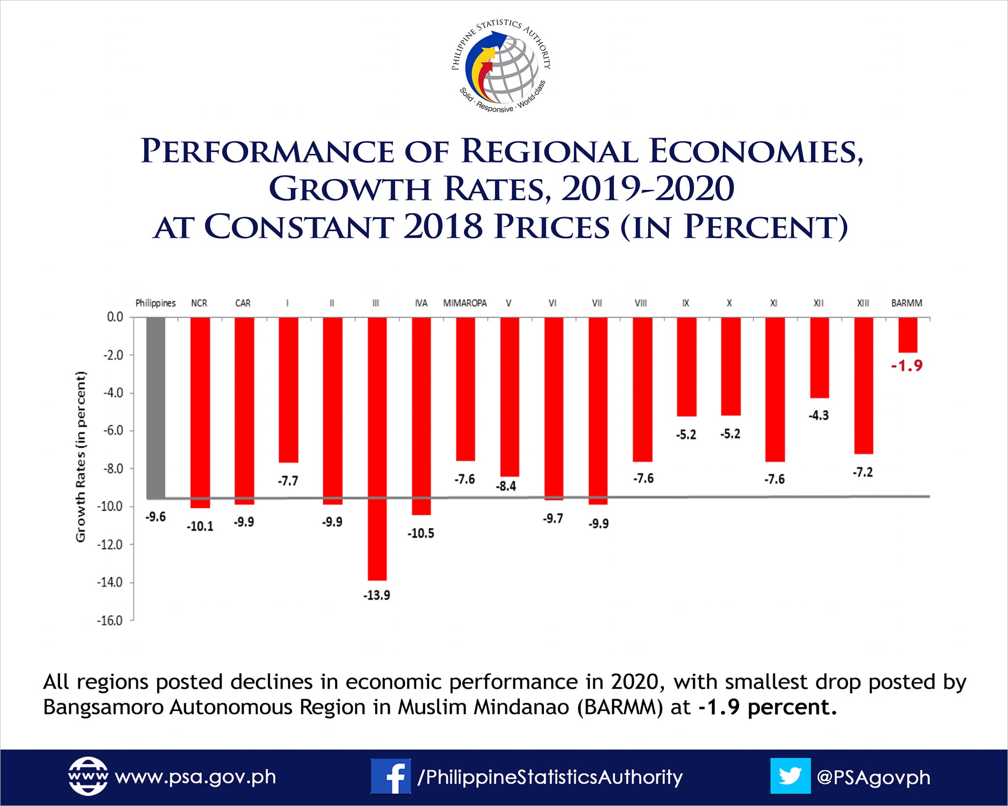 필리핀 내 모든 지역의 지역내총생산(GRDP)이 감소했지만, 그중에서도 가장 많이 감소한 지역은 메트로 마닐라 인근에 있는 중앙 루손 지방(13.9% 감소)과 칼라바르손 지방(10.5% 감소)이다. 가장 적게 감소한 곳은 방사모로 이슬람 자치구(1.9% 감소)이지만, 해당 지역은 필리핀 내에서도 가장 경제적으로 낙후된 지역이라 필리핀 경제에 큰 영향력을 미치지 못한다. 한편, 필리핀 2020년 총 경제성장률은 –9.5%로 제2차 세계대전 이후 최저치를 기록했다. 그리고 2021년 1월 기준 필리핀 통계청(PSA)에서 발표한 실업자 규모는 약 400만 명이다. 필리핀 노동자 단체에서는 코로나19 이후 약 580만 명 노동자가 실직했다고 보고 있다. 580만 명이면 싱가포르 인구와 거의 같다.