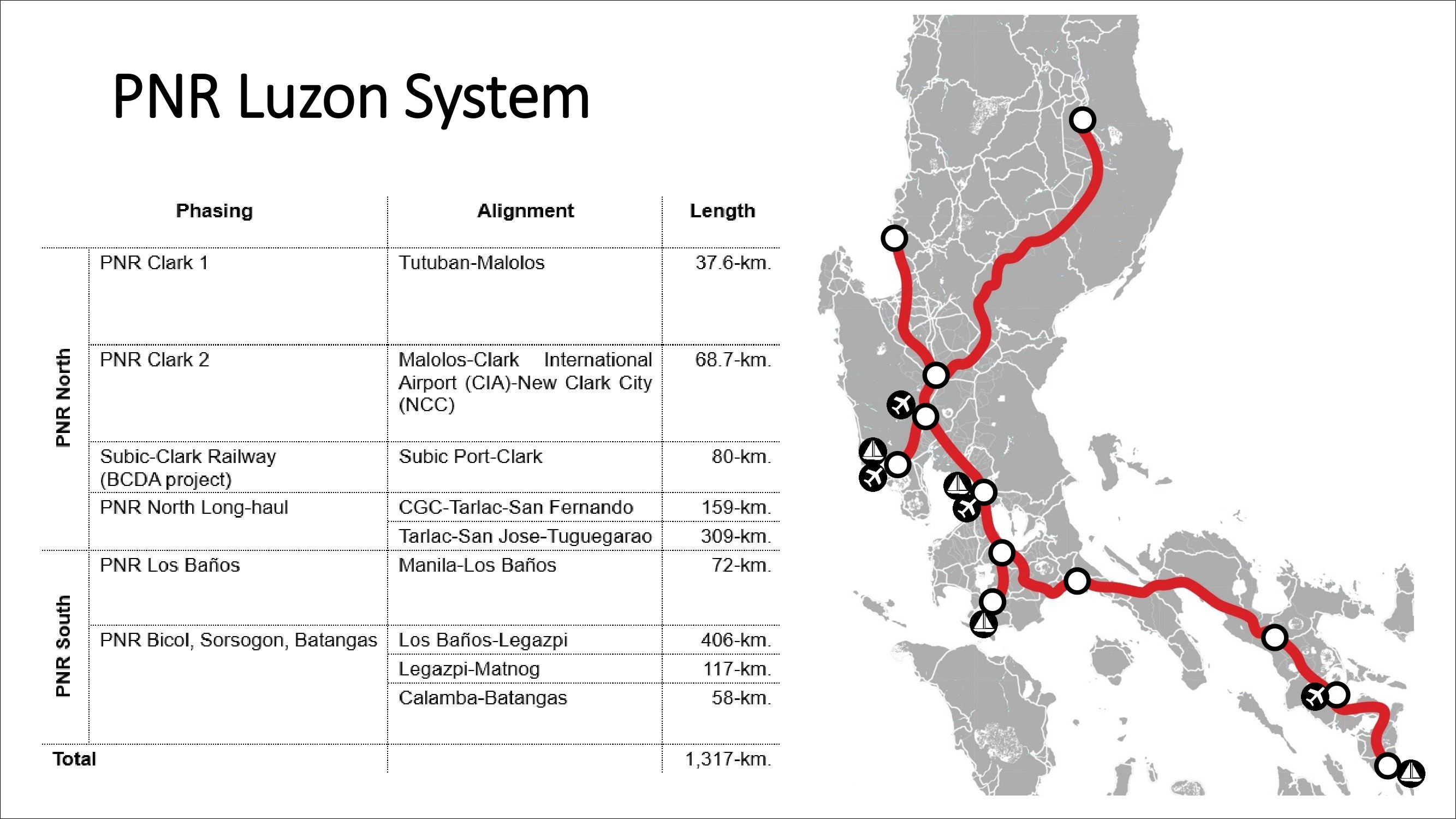 요즘 필리핀 PNR에서 가장 집중하는 프로젝트는 NSCR(North-South Commuter Railway)라고 부르는 장거리 남북통근 철도 프로젝트이다. 남북통근철도(NSCR)는 루손섬 북쪽의 뉴클락시티(New Clark City)에서 메트로 마닐라(Metro Manila)를 지나 남쪽 칼람바(Calamba)까지 147km를 연결하는 프로젝트로 철도 인프라를 확충하여 클락에서부터 메트로 마닐라 지역까지 이동 편의성을 높이는 것을 목표로 한다.