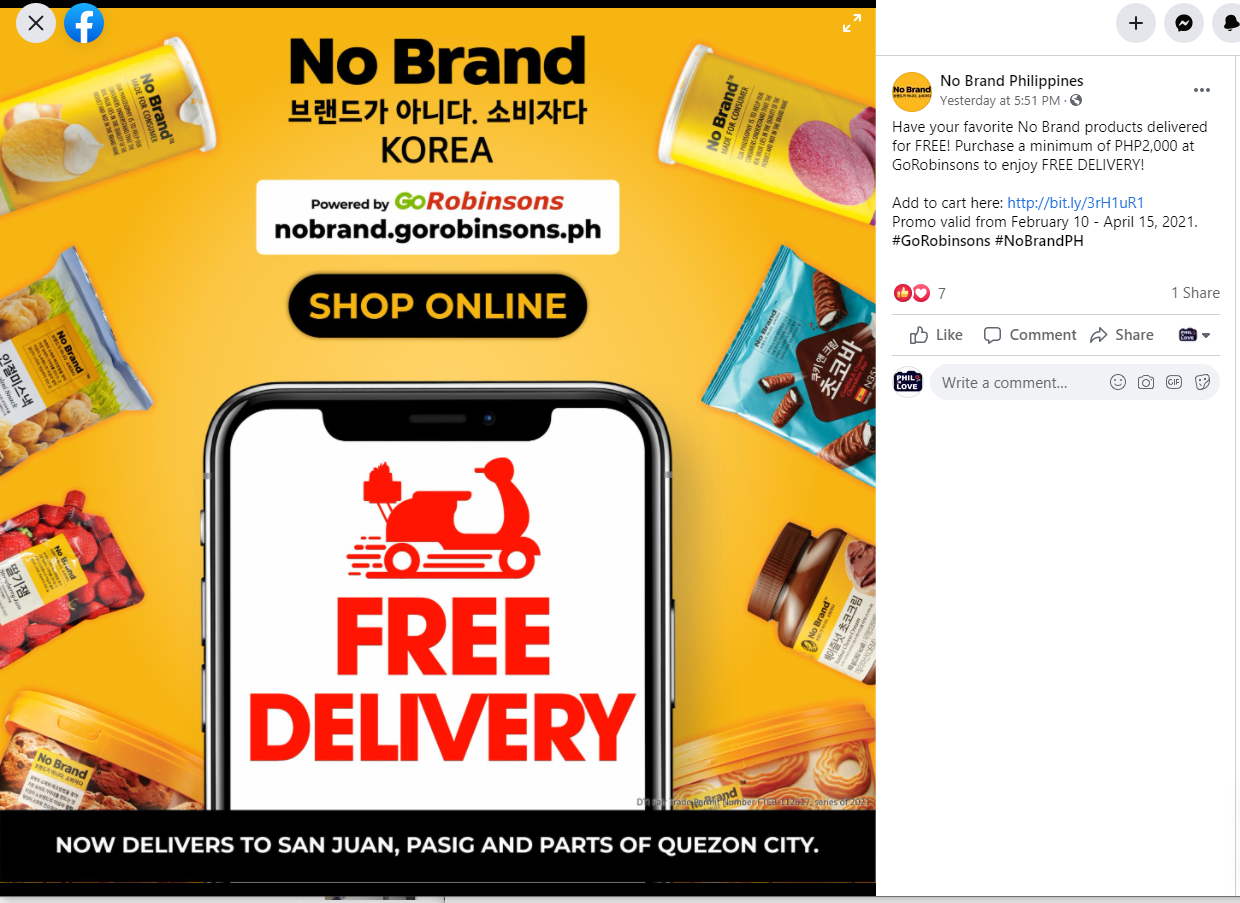 현재 필리핀에는 총 4개의 노브랜드(No Brand) 매장이 운영되고 있는데, 메트로 마닐라의 산후안(San Juan), 파식(Pasig), 퀘존시티(Quezon City) 일부 지역에서는 온라인 쇼핑몰로도 이용이 가능하다. 노브랜드 필리핀에서는 곧 메트로 마닐라 다른 지역까지 온라인 주문(배송)이 가능하도록 할 방침이다.