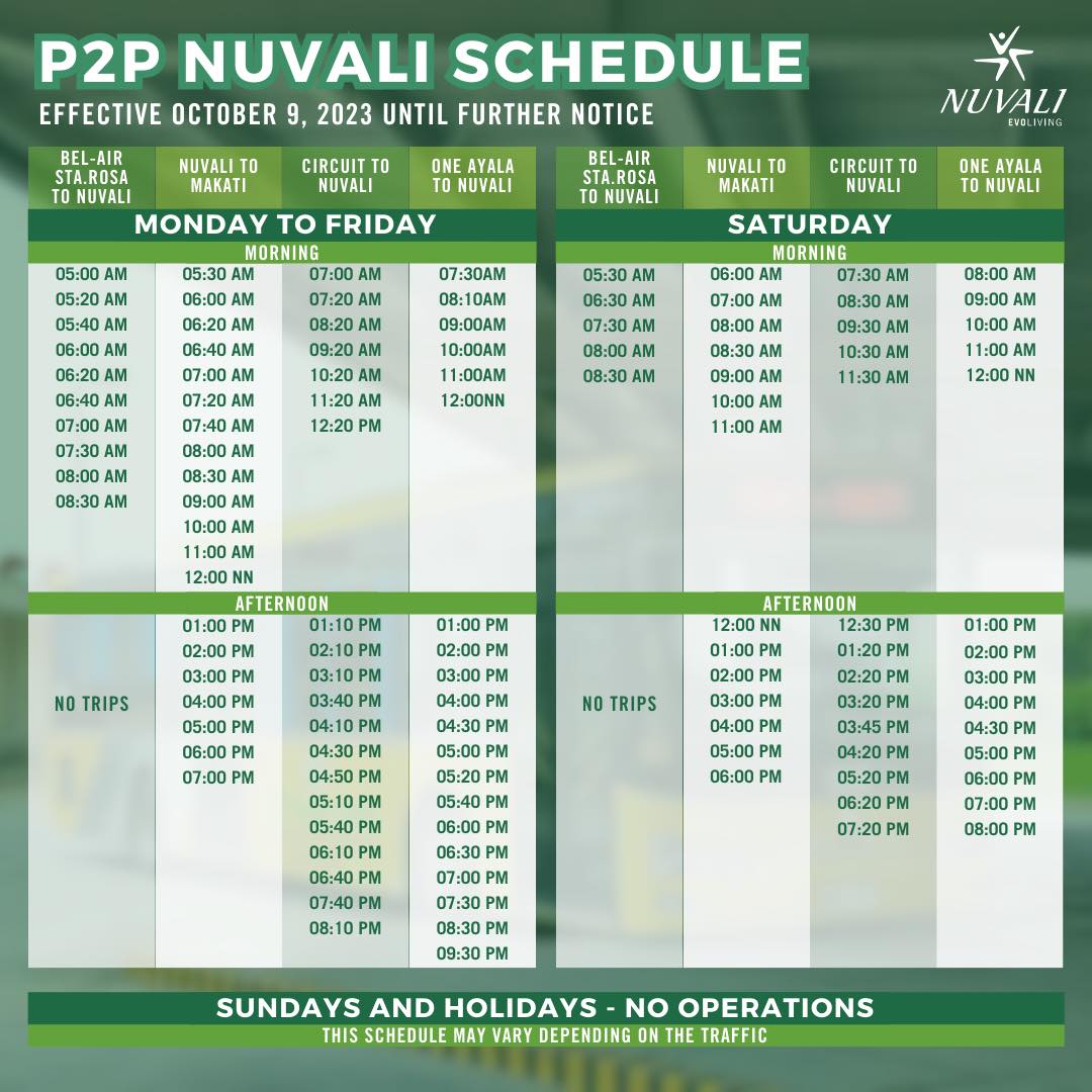 · Nuvali: P2P Bus Schedule effective on October 9, 2023 until further notice