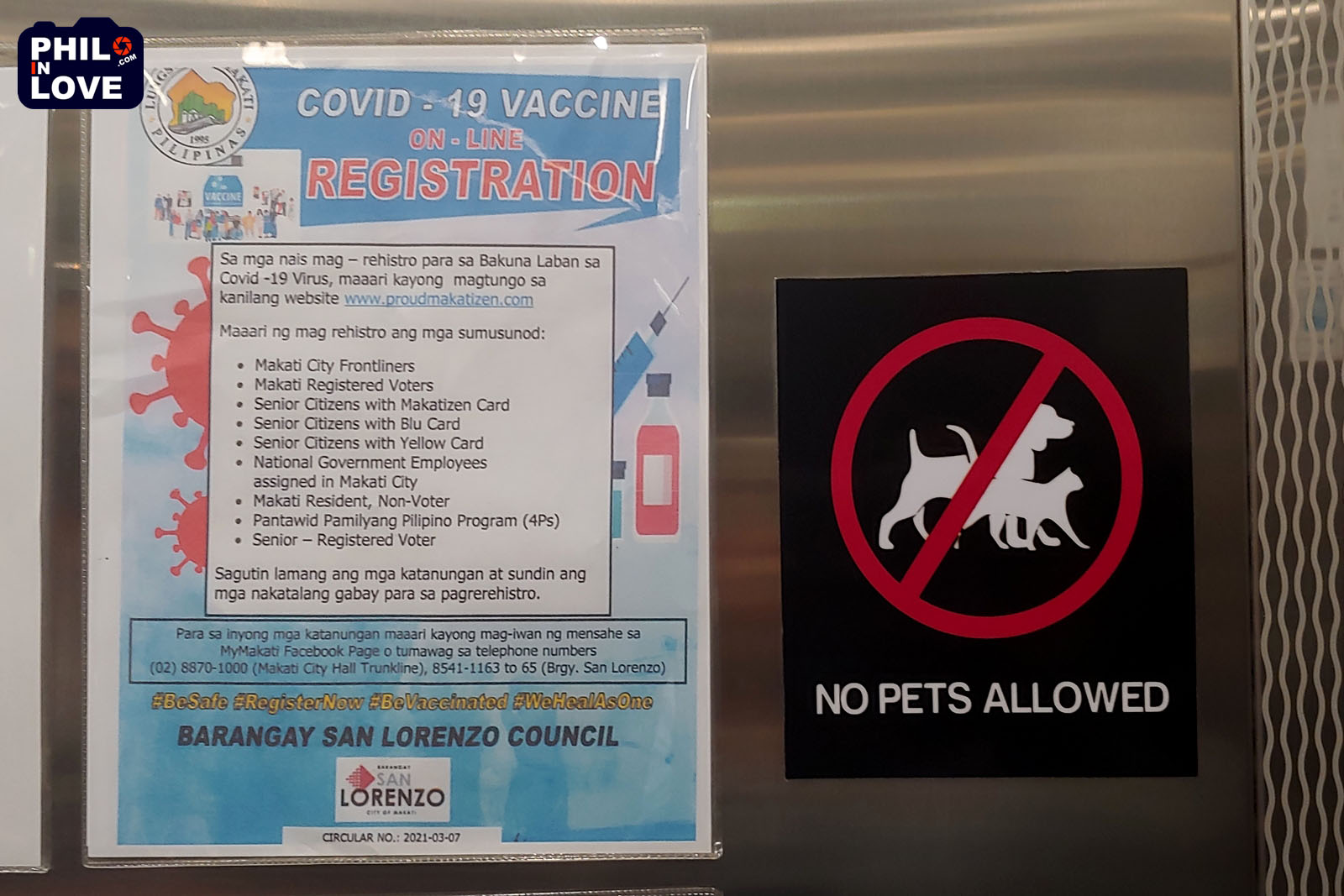현재 필리핀 정부는 백신 접종에 대한 통합된 사이트를 운영하고 있지 않다. 그래서 메트로 마닐라에 사는 필리핀인이 코로나19 백신 접종을 원한다면 거주하고 있는 시(City)에서 운영하는 온라인 접수처로 백신 접종을 신청해야만 한다. 예방접종 대상자도 지역별로 다른데, 마카티 시티의 경우 "투표권이 없는 마카티 거주자"도 예방접종 신청이 가능하도록 하고 있다.