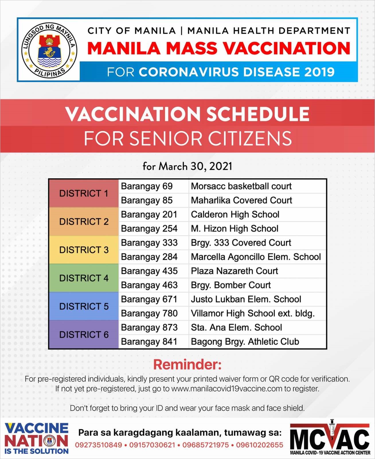 2021년 4월 3일 현재 메트로 마닐라 지역의 백신 접종은 다음과 같이 진행되고 있다. 아래 내용은 각 시에서 운영하는 페이스북과 신문 기사 등을 통해 얻은 자료를 정리한 것으로 대략적인 진행 상황만 간략히 기재하였다.