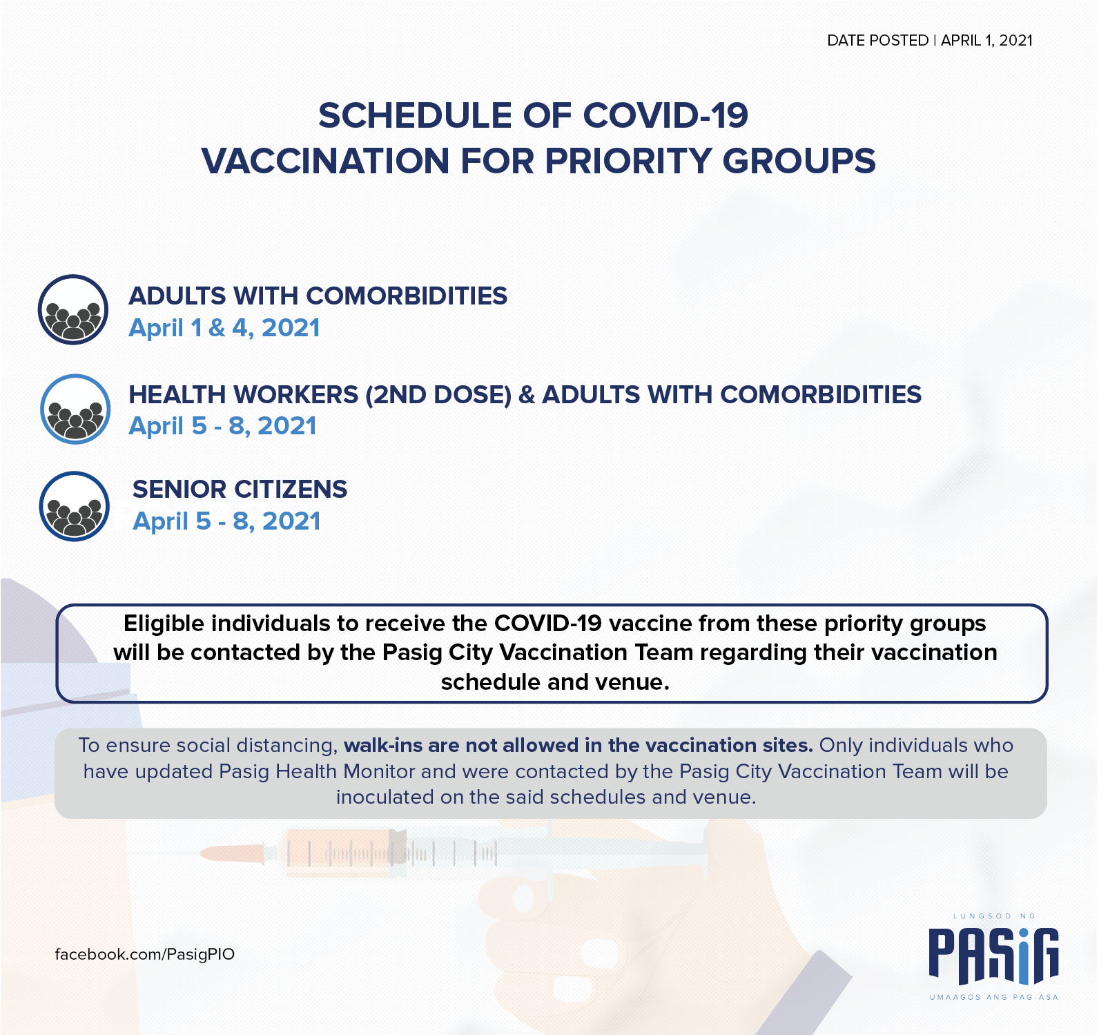 ■ 파식 시티(Pasig City)는 메트로 마닐라에서 가장 먼저 예방 접종 계획을 승인받은 지방자치단체이다. 파식 시티가 코로나19 백신에 할당한 예산은 300밀리언페소(3억페소)로 의료 종사자들을 우선 접종대상으로 삼고 아스트라제네카 백신을 투여하기 시작했다. 파식시에서 운영하는 파식패스 앱(PasigPass app)에서 예방접종프로그램을 확인할 수 있다.