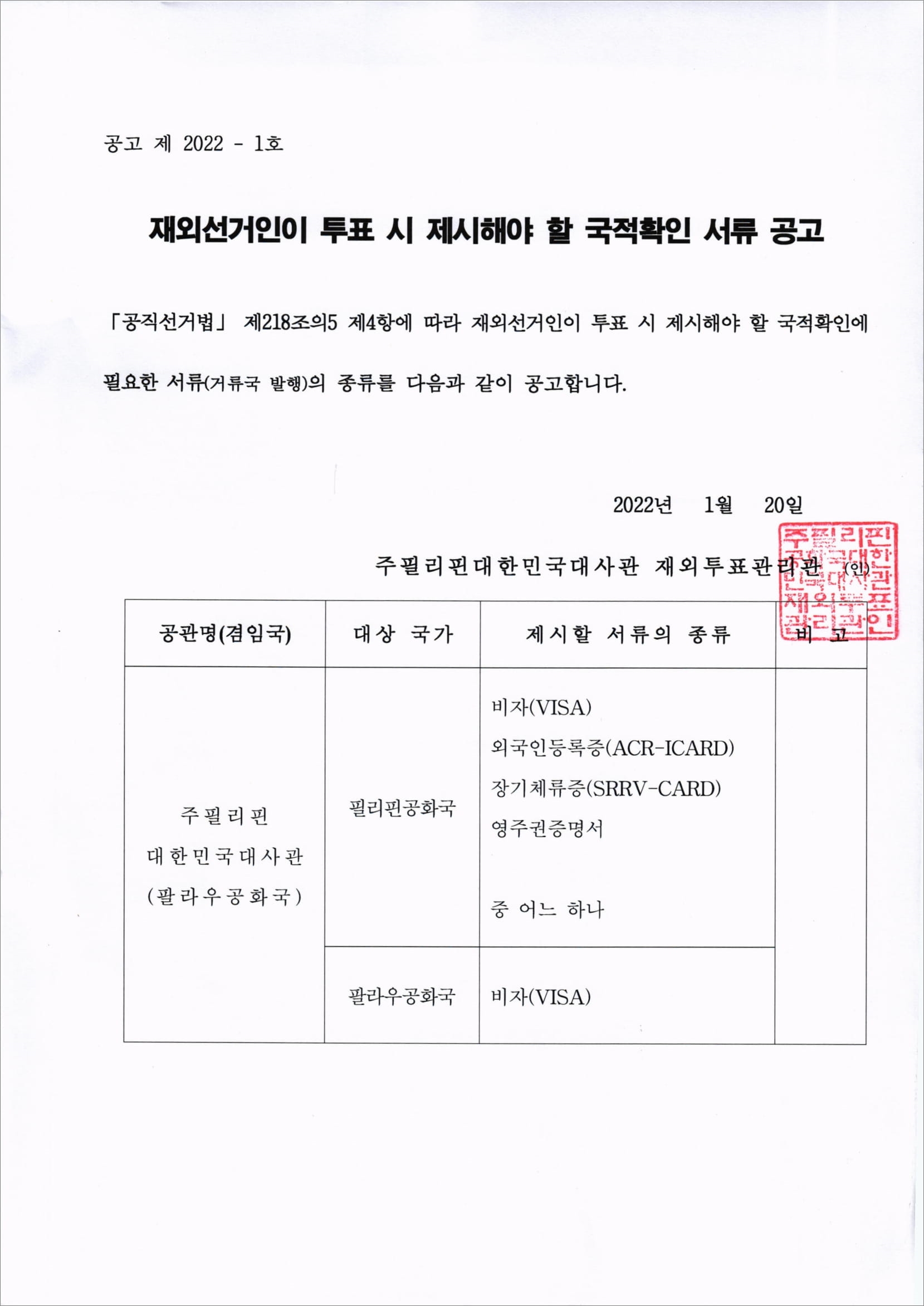 · 주 필리핀 대한민국 대사관 : 재외선거인이 투표 시 제시해야 할 국적확인 서류 공고