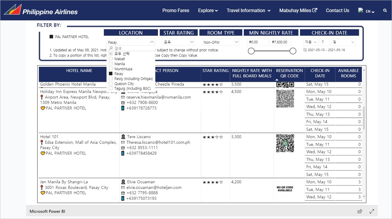 ※ 주의 : 필리핀항공의 웹사이트를 통해 바로 호텔을 예약할 수는 없다. 하지만 이 정도의 정보라도 제공하는 곳이 딱히 없어서 참고 자료로 쓸 만하다.