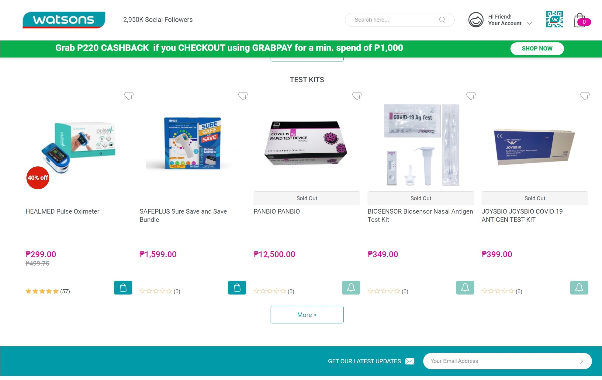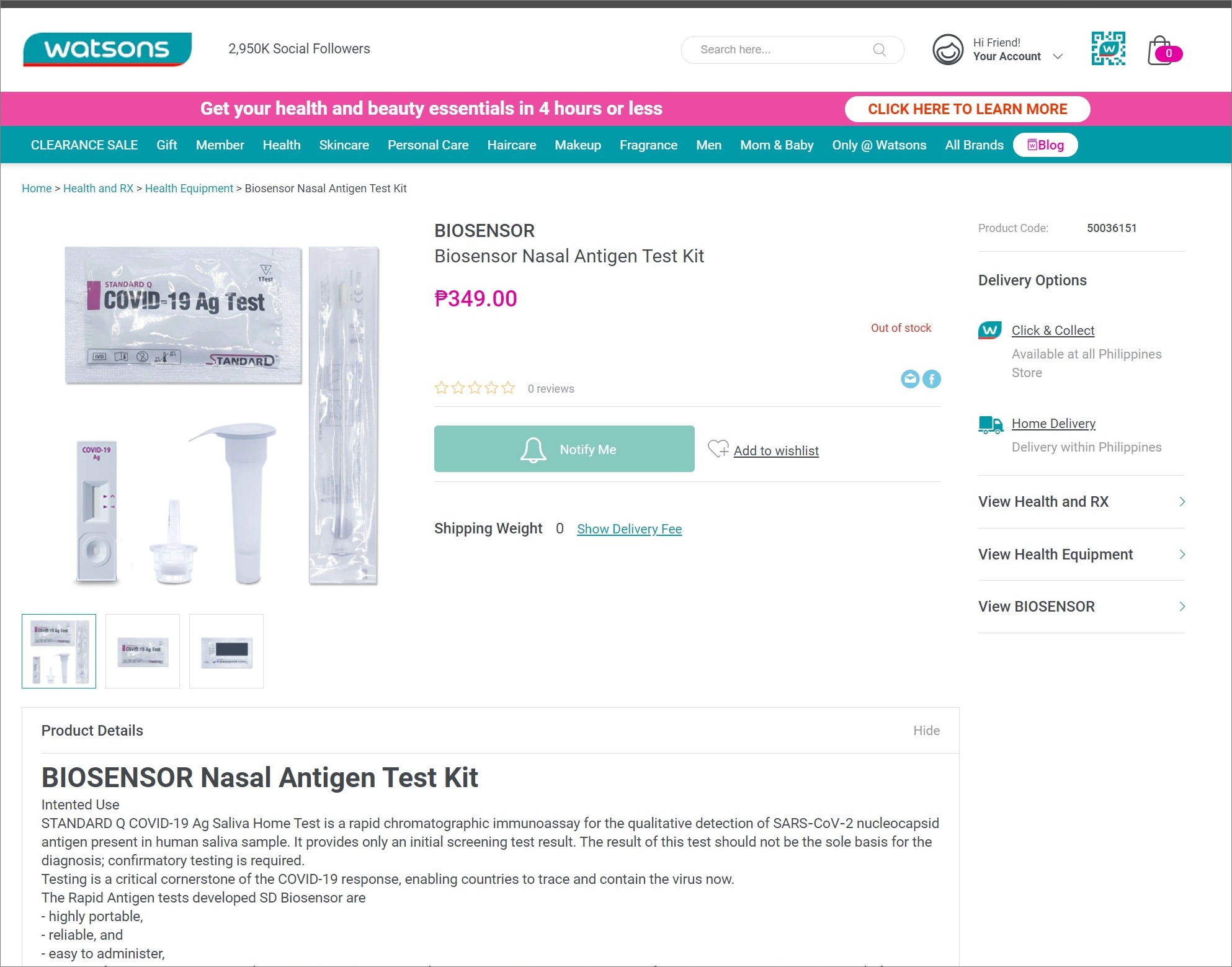 그런데 왓슨스(Watsons Philippines)에서 운영하는 웹사이트를 보면 COVID-19 Ag Home Test 또는 COVID 19 ANTIGEN TEST KIT라는 이름으로 애보트(Abbott) 사의 판비오나 에스디 바이오센서(SD BIOSENSOR), JOYSBIO 등과 같은 코로나 진단키트를 판매하는 것을 볼 수 있다. 모두 신속 항원검사(Rapid Antigen test) 방식의 진단키트이며 FDA의 승인을 받은 제품이라고 한다. 가격대도 349페소, 399페소 등 비교적 나쁘지 않은 편이다. 하지만 실제 구매를 시도해보면 제품이 없다고 Out of stock으로 표기되는 것을 볼 수 있다. 왓슨스에서는 지난해 10월 25일부터 해당 제품에 대한 판매를 시작하고 전국 모든 매장에 코로나19 항원신속검사 키트 제품이 있다고 홍보하고 있지만 처방전이 있는 사람에게만 판매하고 있기 때문이다. 따라서 아직 두통약을 구매하듯 쉽게 살 수 없다. 한편, 필리핀 보건부에서는 이번 달 중순 정도에 코로나19 자가진단 키트 사용에 대한 지침을 발표할 예정이다.