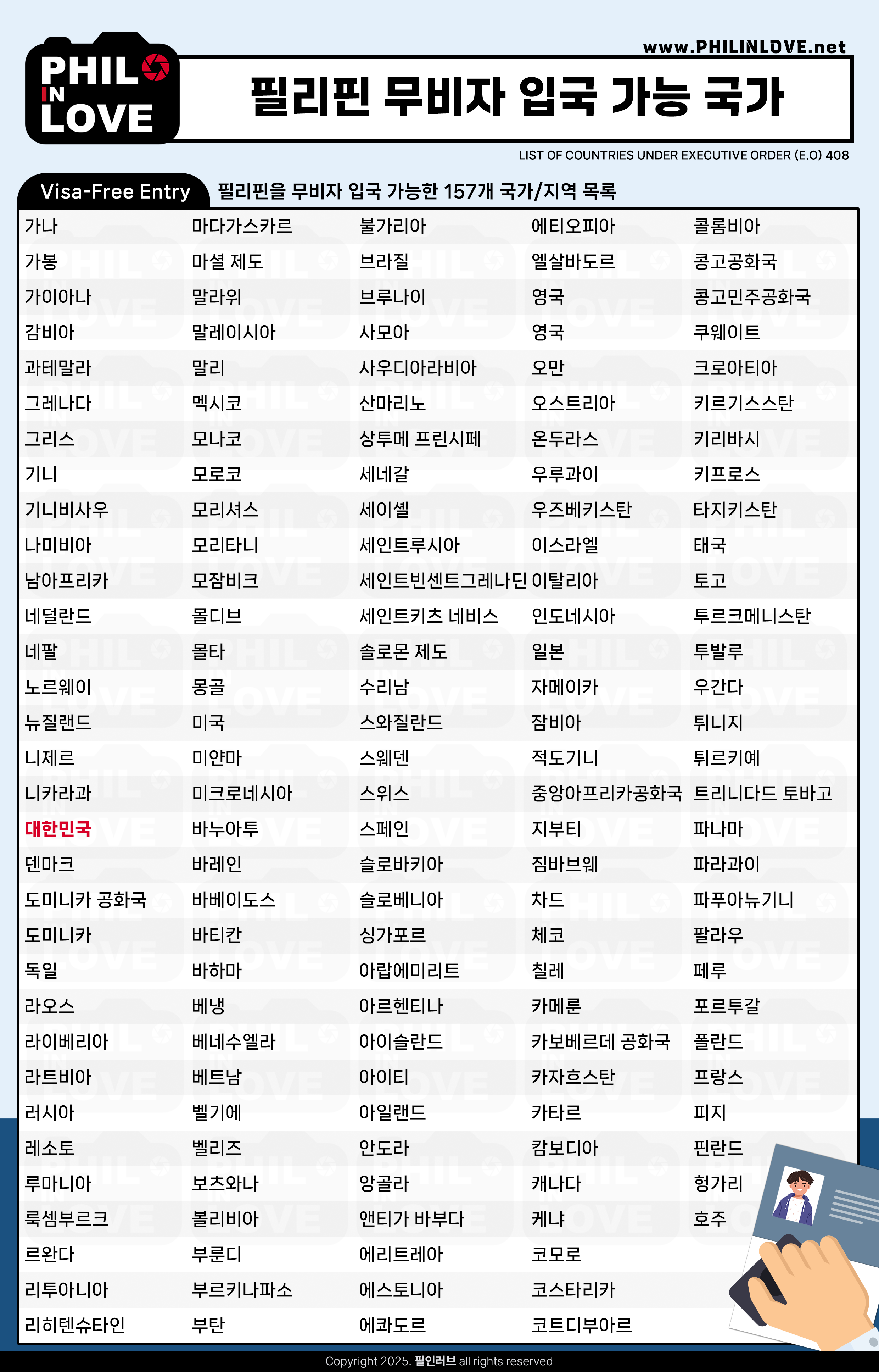 필리핀 이민국: 필리핀 무비자 입국이 가능한 157개 국가/지역 목록 - 한국 포함