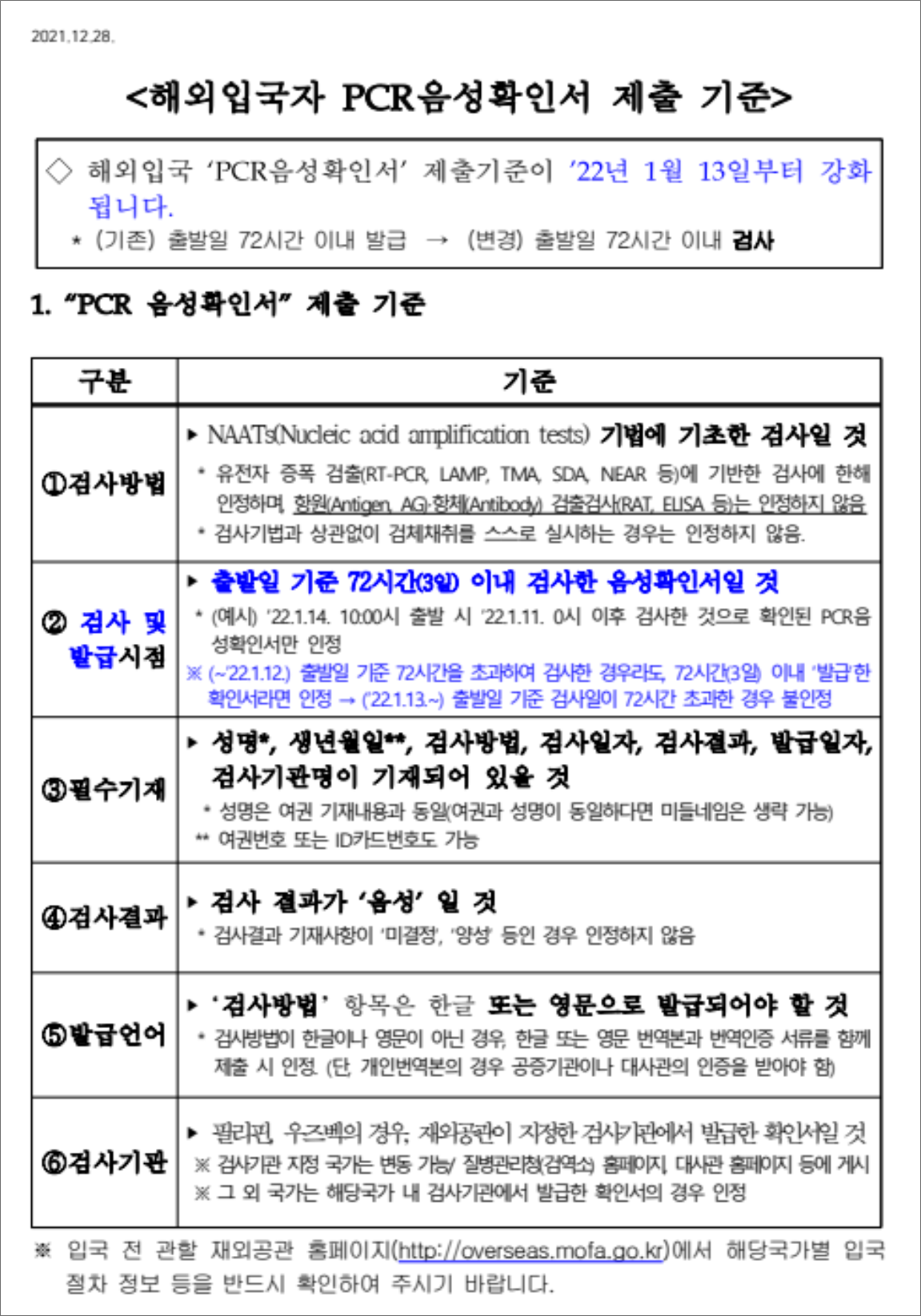 2022년 1월 13일부터 한국 입국 시 필요한 PCR 음성확인서 제출 기준이 <출발일 기준 72시간 이내 발급>에서 <출발일 기준 72시간 이내 검사>로 강화된다. PCR 음성확인서 유효기간이 발급일 기준에서 검사일 기준으로 변경된다고 이해하면 된다. PCR 음성확인서를 제출하지 않거나 유효하지 않은 PCR 음성확인서를 제출하는 경우 항공기 탑승이 거부될 수 있다.
