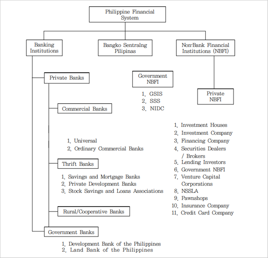 은행은 개인 소유인 사립은행과 정부 소유인 국책은행으로 분류되며, 사립은행은 다시 상업은행(universal or commercial banks)과 저축은행(thrift or savings banks), 영농·협동은행(rural and cooperative banks)으로 분류된다. 은행 설립 및 신규 금융상품 판매에 대한 승인 권한은 필리핀 중앙은행(BSP)이 가지고 있다.