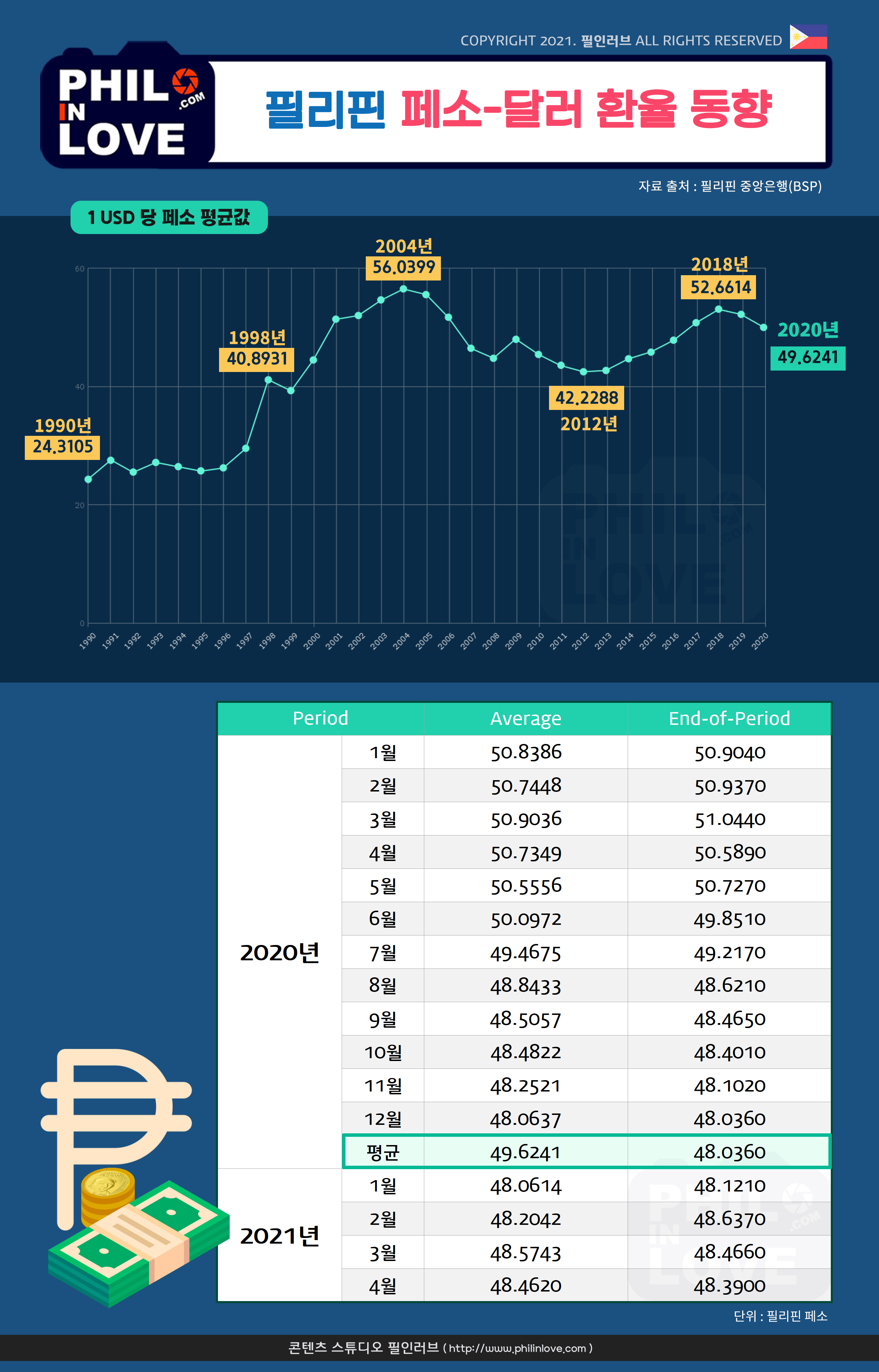 [필리핀 경제] 페소-달러 환율 동향 (1990년~2021년 4월)