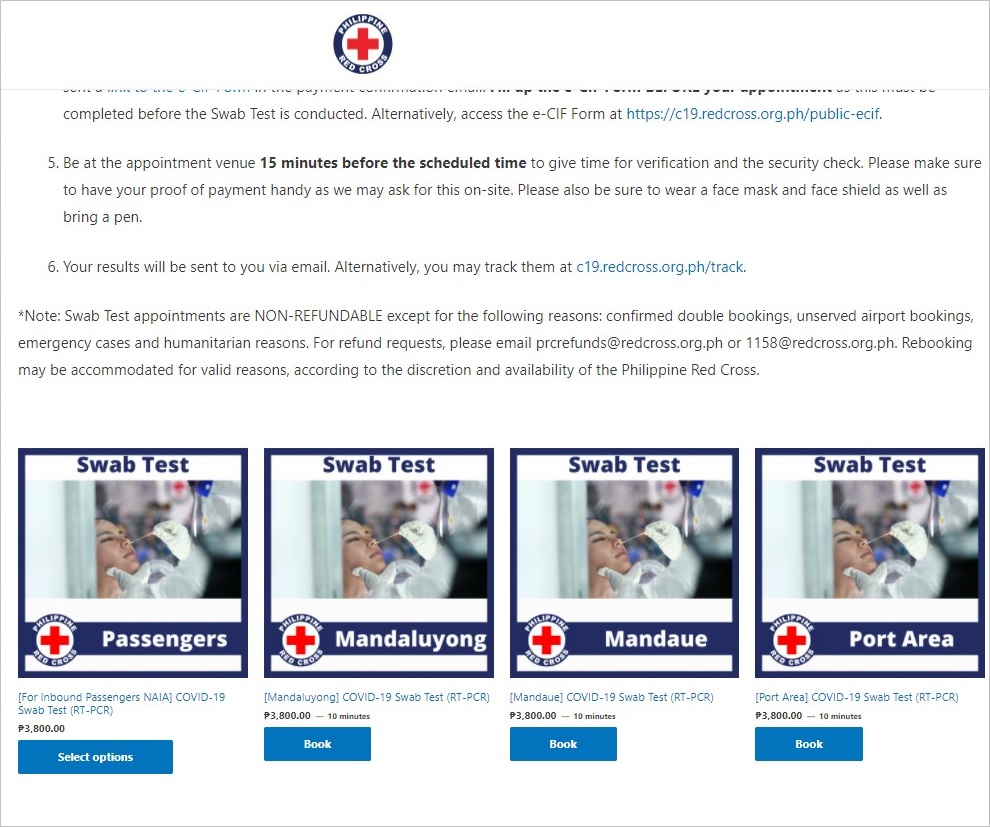 - 예약하기(Book a Swab Test) : book.redcross.org.ph/index.php/book-a-swab-test/