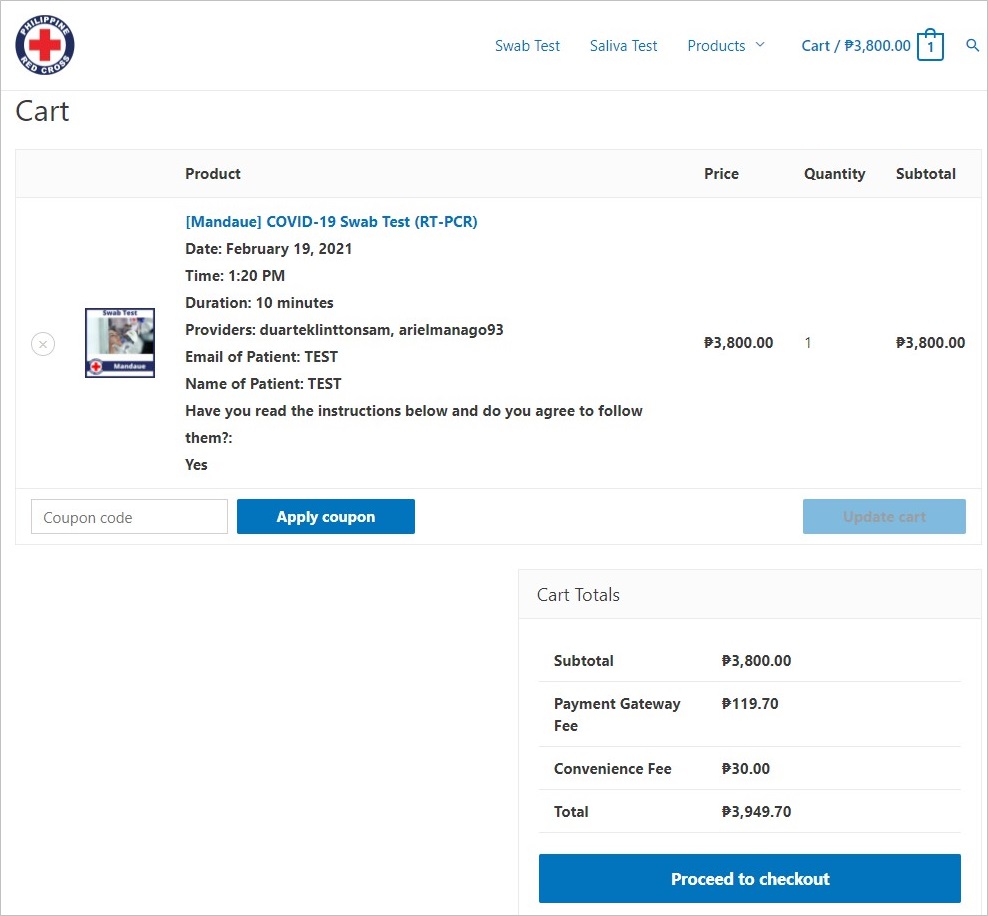 필리핀 적십자(Philippines Red Cross)는 직원이 매우 친절하고온라인 예약시스템도 잘 갖추고 있지만 기대만큼 코로나19 검사비가 저렴하지 않다. 적십자(PRC)로 전화를 해서 RT-PCR 검사 비용이 얼마나 되는지 문의를 하면 3,800페소라고 안내해주지만, 막상 예약을 시도해보면 Payment Gateway Fee와 Convenience Fee 라는 이름으로 수수료가 추가되어서 최종 결제 금액이 3,949페소가 된다. 이용자가 많아서 사람으로 붐비기로 유명한 곳이 적십자라서 천 페소 정도 더 쓰고 좀 더 한가로운 곳에서 검사를 받는 것도 고려해봄 직하다.