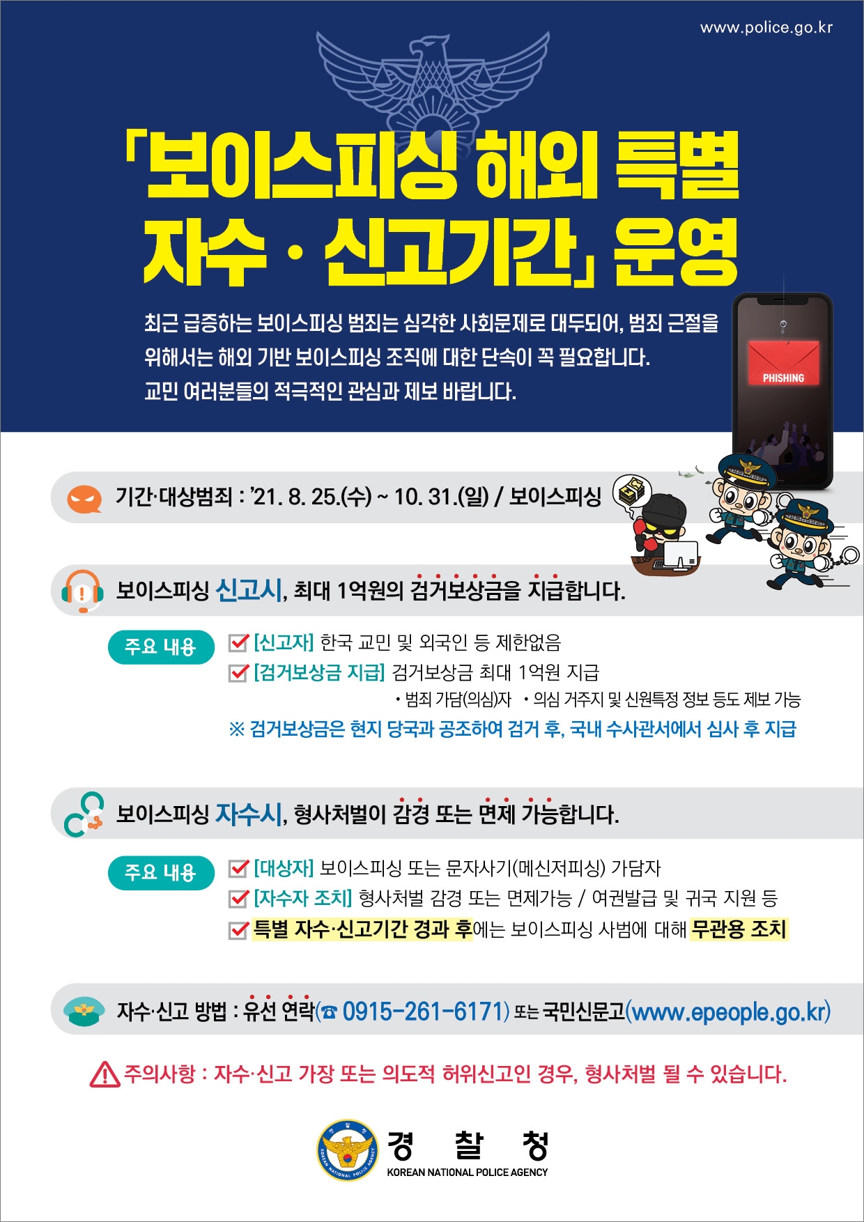 · 주 세부 대한민국 분관 : 보이스피싱 해외 특별 자수·신고기간 공고 (12.31까지 연장)
