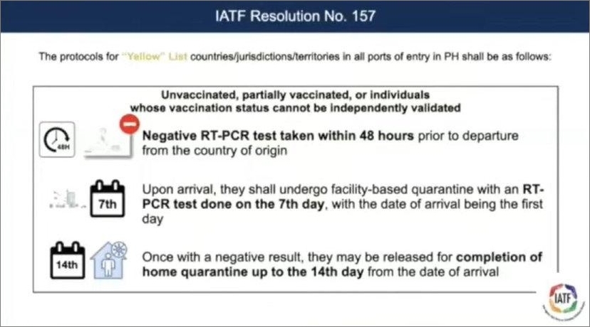 2022년 1월 현재 필리핀 정부에서는 코로나19 확진자 수에 따라 전 세계 국가를 레드-옐로-그린 세 가지 색깔로 분류한 뒤 필리핀 입국 시 다른 격리조치를 적용하고 있다. 1월 13일 서명된 태스크포스(IATF)의 결의안(Resolution No. 157)에 따르면 1월 16일부터 녹색국가(저위험국가)에서 입국한 예방접종완료자는 시설 격리 면제받을 수 있게 된다. 하지만 현재 대한민국은 중위험국가인 옐로 리스트(Yellow List)로 분류되고 있기 때문에 필리핀 입국 시 시설 격리를 완전히 면제받지 못한다. 백신접종 여부와 무관하게 무조건 호텔에서 격리 기간을 보내야 하는 셈이다.