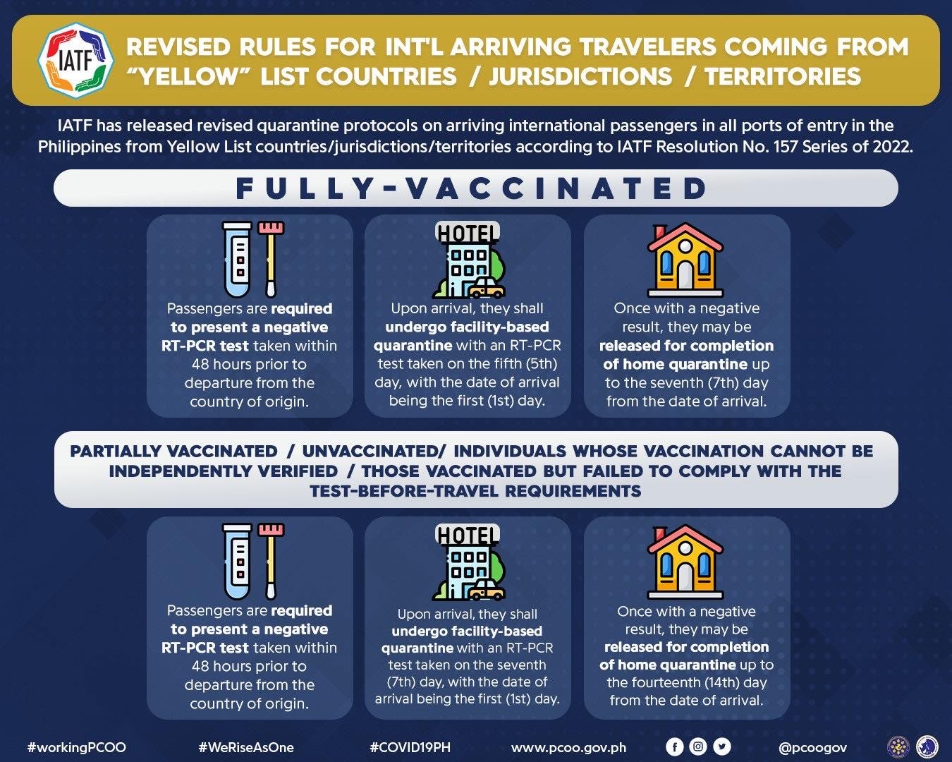 Upon arrival, they shall undergo facility-based quarantine with an RT-PCR test taken on the fifth (5th) day, with the date of arrival being the first day. Once with a negative result, they may be released for completion of home quarantine up to the seventh (7th) day from the date of arrival.