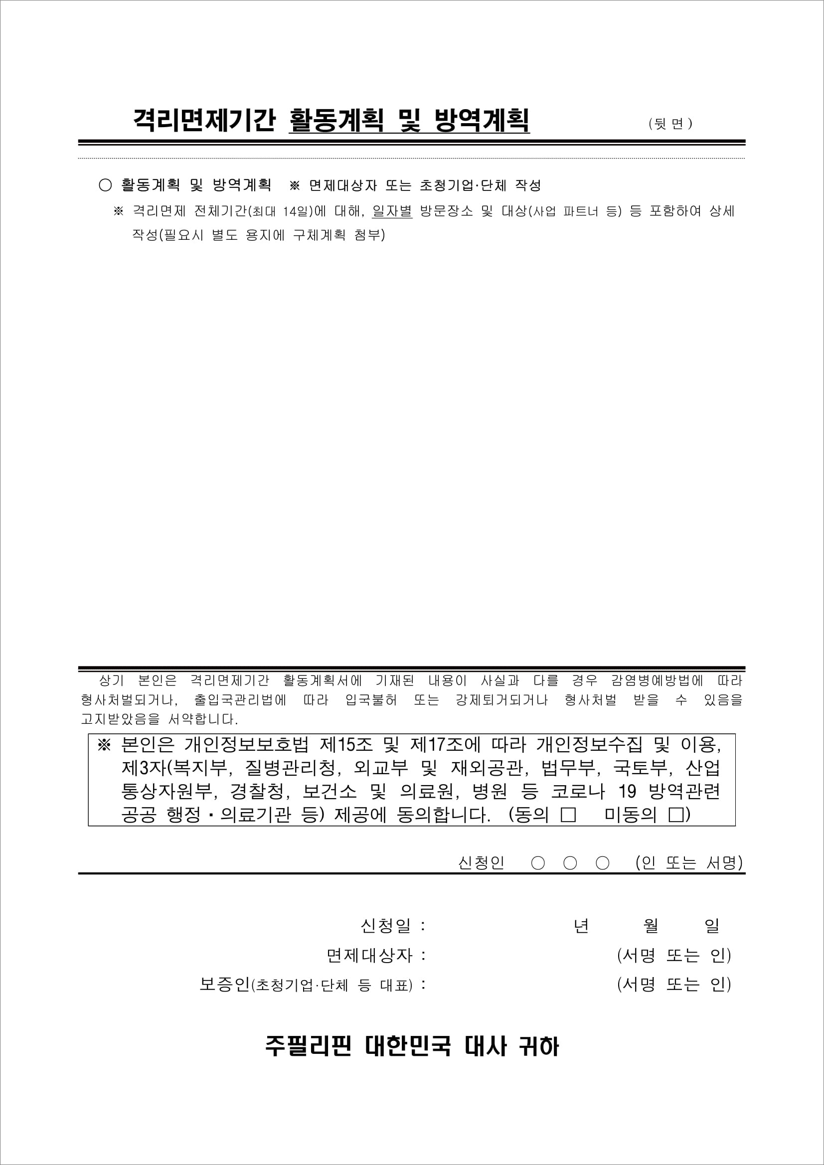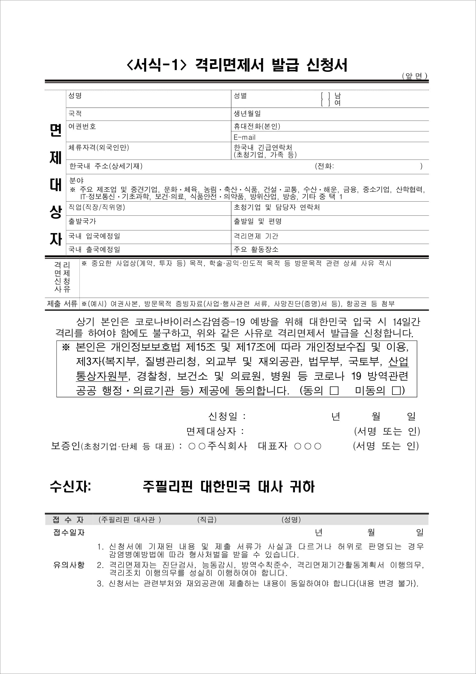 · 주 필리핀 대한민국 대사관 : 격리면제서 발급 종합 안내 (6.2 수정)