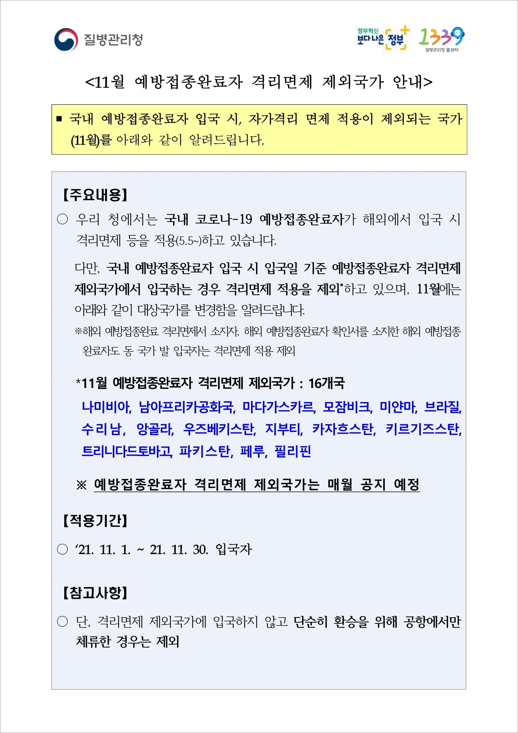 · 질병관리청 : 211021 예방접종완료자 격리면제 제외국가 안내(11월)
