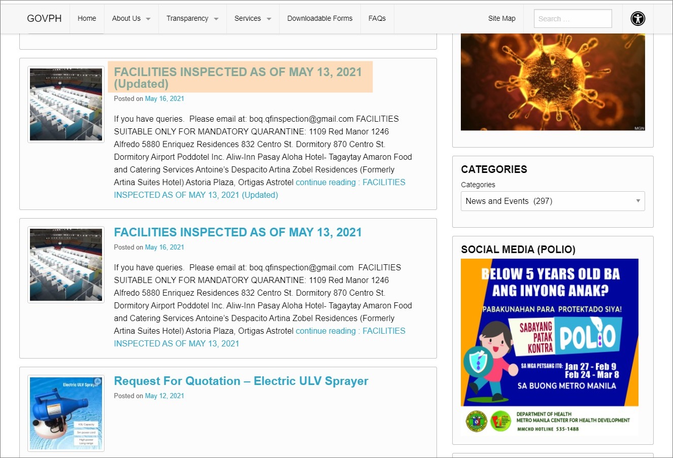 ■ 격리시설 목록은 필리핀 검역국(BOQ) 웹사이트에서 확인할 수 있다. 수시로 업데이트되기 때문에 최신 공지사항을 확인하는 것이 좋은데, "FACILITIES INSPECTED AS OF (날짜)"라고 적힌 공지사항 중 가장 최신 날짜의 것을 보면 된다.