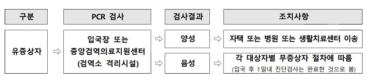 | 변경 전 | 모든 해외 입국자들은 입국 전, 입국 1일 차, 입국 6∼7일 차에 한 번씩, 총 3번 PCR(유전자 증폭)검사 |