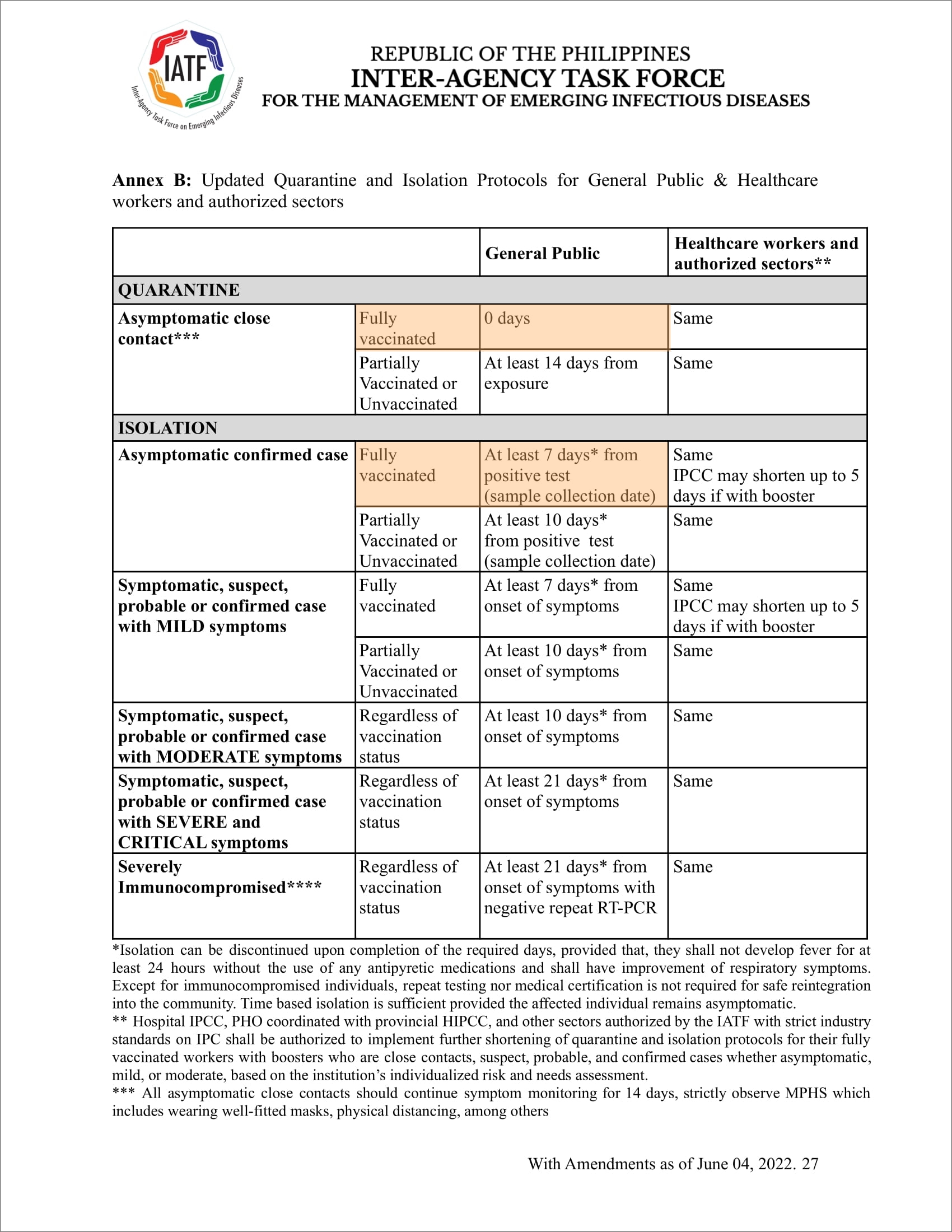 ※ 아래 규정은 보건부에서 일반인을 대상으로 안내하는 자가격리 기간이다. 필리핀 보건부에서는 의료종사자 등에 대해서는 별도의 규정을 적용하고 있다.