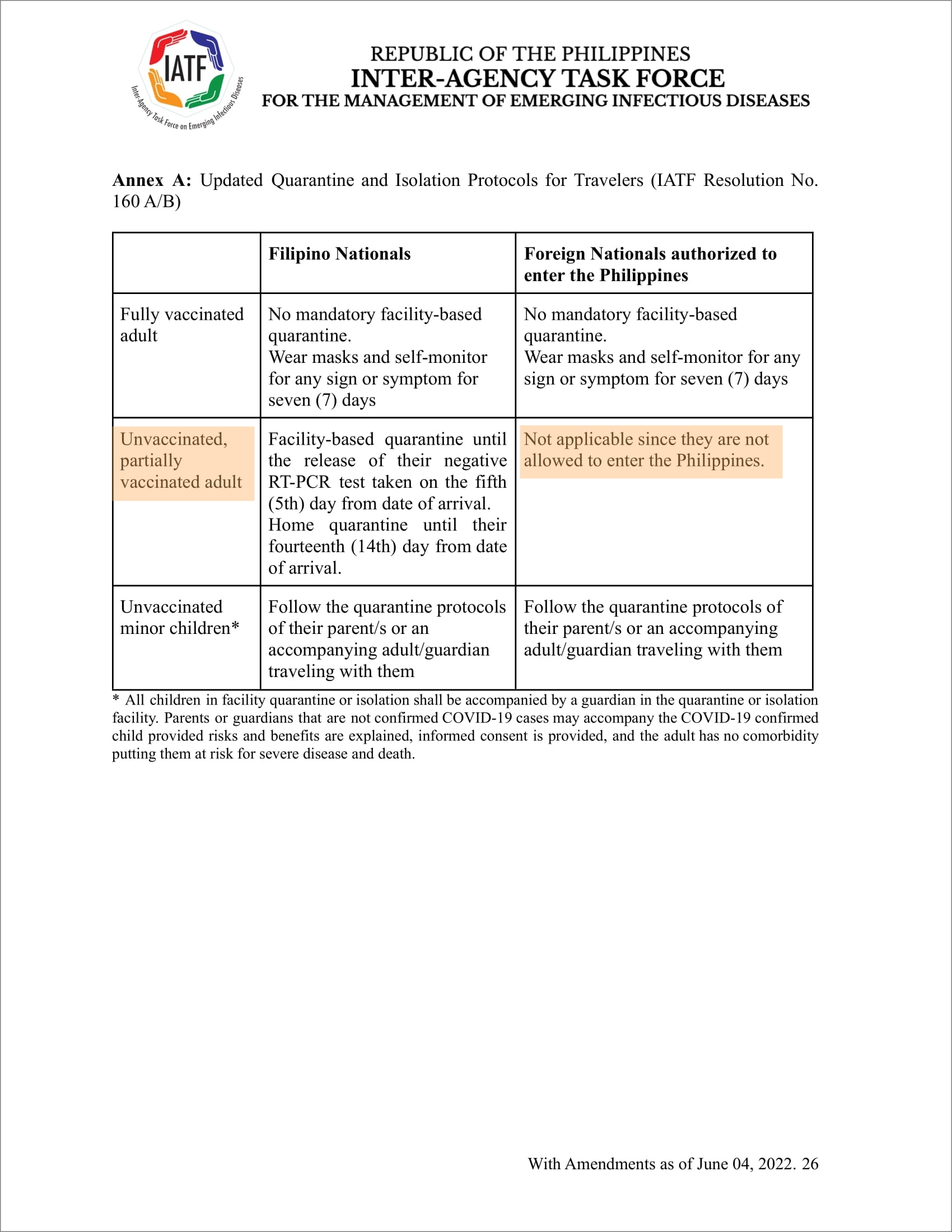 간혹 입국 후 격리를 조건으로 하여 필리핀 입국이 가능하다는 이야기가 들리기도 하지만, 외국인이 아닌 필리핀인을 대상으로 한내용이다. 이 부분에 대해 좀 더 자세히 보고 싶다면 2022년 6월 현재 필리핀 IATF에서 발표한 여행자를 위한 격리 프로토콜을 보면 된다. 백신미접종자에 대한 격리규정에 대해 "필리핀 입국이 불가능하므로, 해당 사항 없음(Not applicable since they are not allowed to enter the Philippines.)"고 명시되어 있는 것을 볼 수 있다. 한편, 필리핀 정부에서는 백신접종을 하지 않은 미성년자(Unvaccinated minor children)에 대해서는 보호자의 검역 절차를 따르도록 하고 있다.
