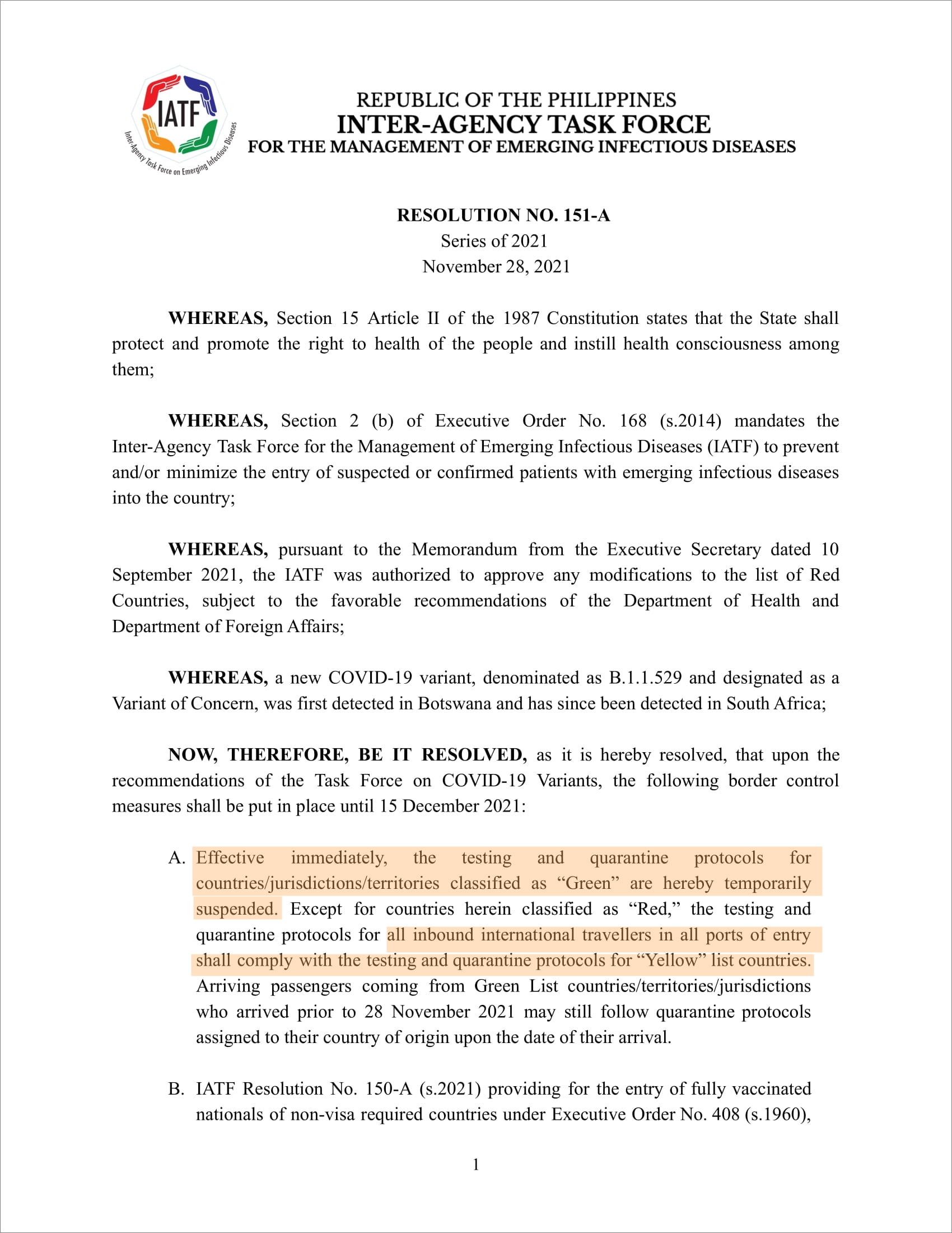 · Inter-Agency Task Force for the Management of Emerging Infectious Diseases, Resolution No. 151-A, dated 28 November 2021