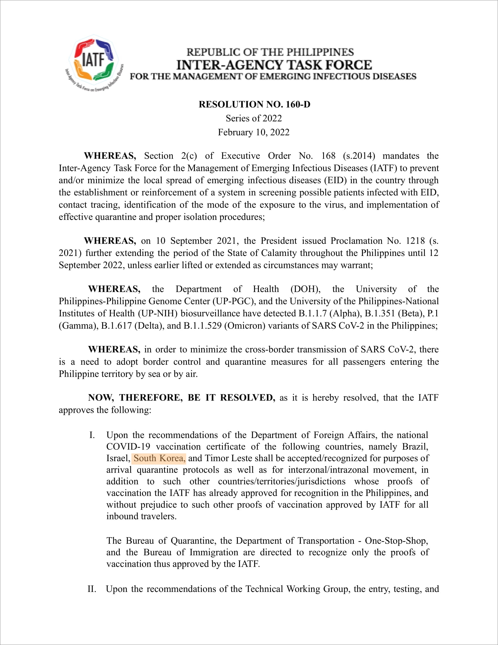 · Official Gazette of the Republic of the Philippines : IATF Resolution No. 160-D