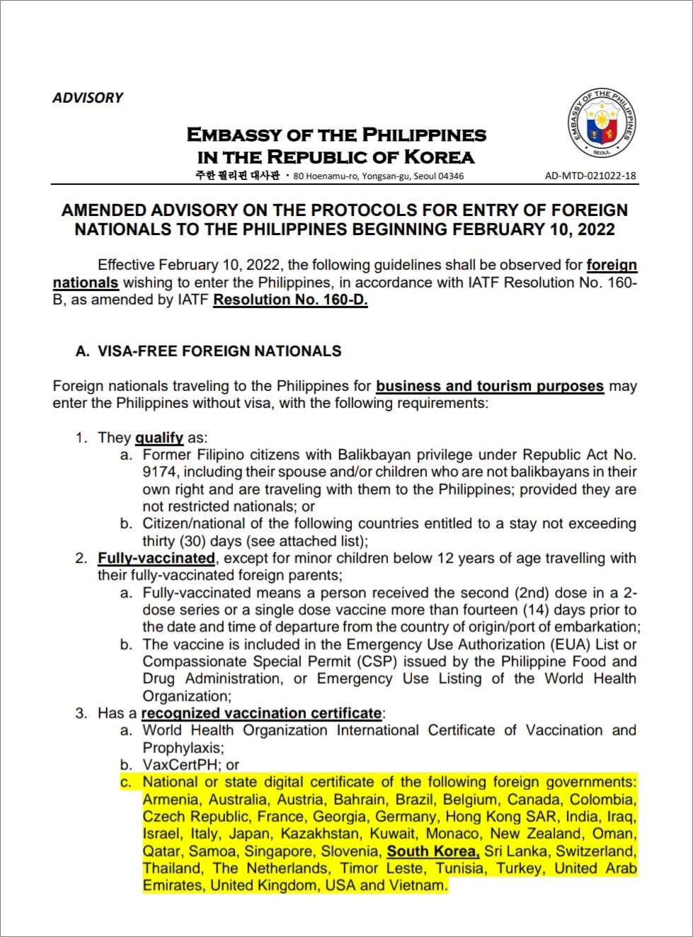- Executive Order No. 408에 따라 대한민국은 무비자 입국 가능 국가에 포함됨