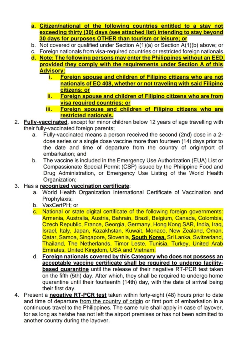 필리핀 식약처의 긴급사용승인(EUA)이나 동정적 특별 허가(CSP) 또는 WHO의 승인을 받은 백신을 접종한 뒤 2주가 경과된 사람으로서 예방접종완료를 입증할 수 있는 사람