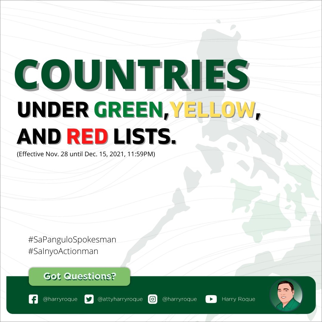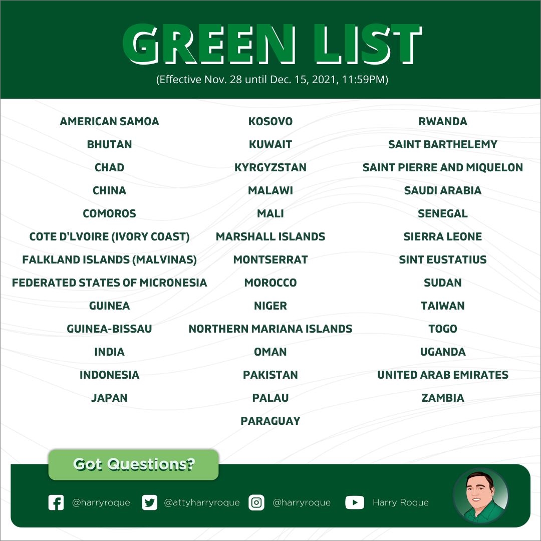 다음 달부터 녹색국가(그린국가)는 필리핀 여행이 가능하다는 식의 이야기는 이만 잊어도 될 것 같다. 오늘 저녁 카를로 노그랄레스(Karlo Nograles) 대통령 대변인이 발표한 바에 따르면 12월 1일부터 시행하기로 한 "녹색 리스트 국가를 대상으로 한 무격리 입국 정책"을 시행하지 않겠다고 한다. 그래서 큰 의미는 없지만 12월 15일까지 적용될 레드·옐로·그린 시스템 대상 국가 목록이 결정된 모양이다.