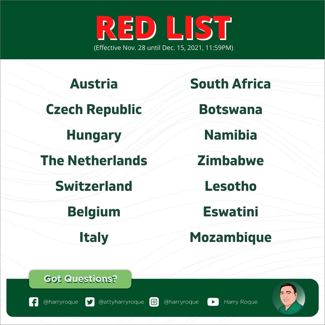 아직 필리핀 이민국에서는 관련 공지가 올라오지 않았지만, 해리 로케 대통령 대변인이 개인 페이스북에 올린 자료에 따르면 오늘부터 외국인의 입국이 금지되는 고위험 국가/지역(적색국가)가 14개국으로 늘었다. 그린리스트 녹색국가(그린국가)는 중국, 일본, 대만 등 40개국이다. 한국은 여전히 중위험 국가/지역(황색국가)으로 분류된다. 다소 독특한 것은 이번 레드·옐로·그린 시스템(Red-Yellow-Green system) 목록이 오늘(11월 28일)부터 2021년 12월 15일까지 적용된다는 점이다.