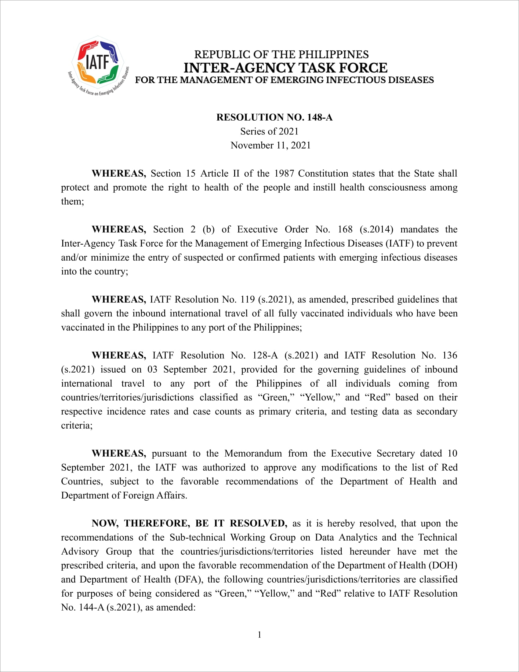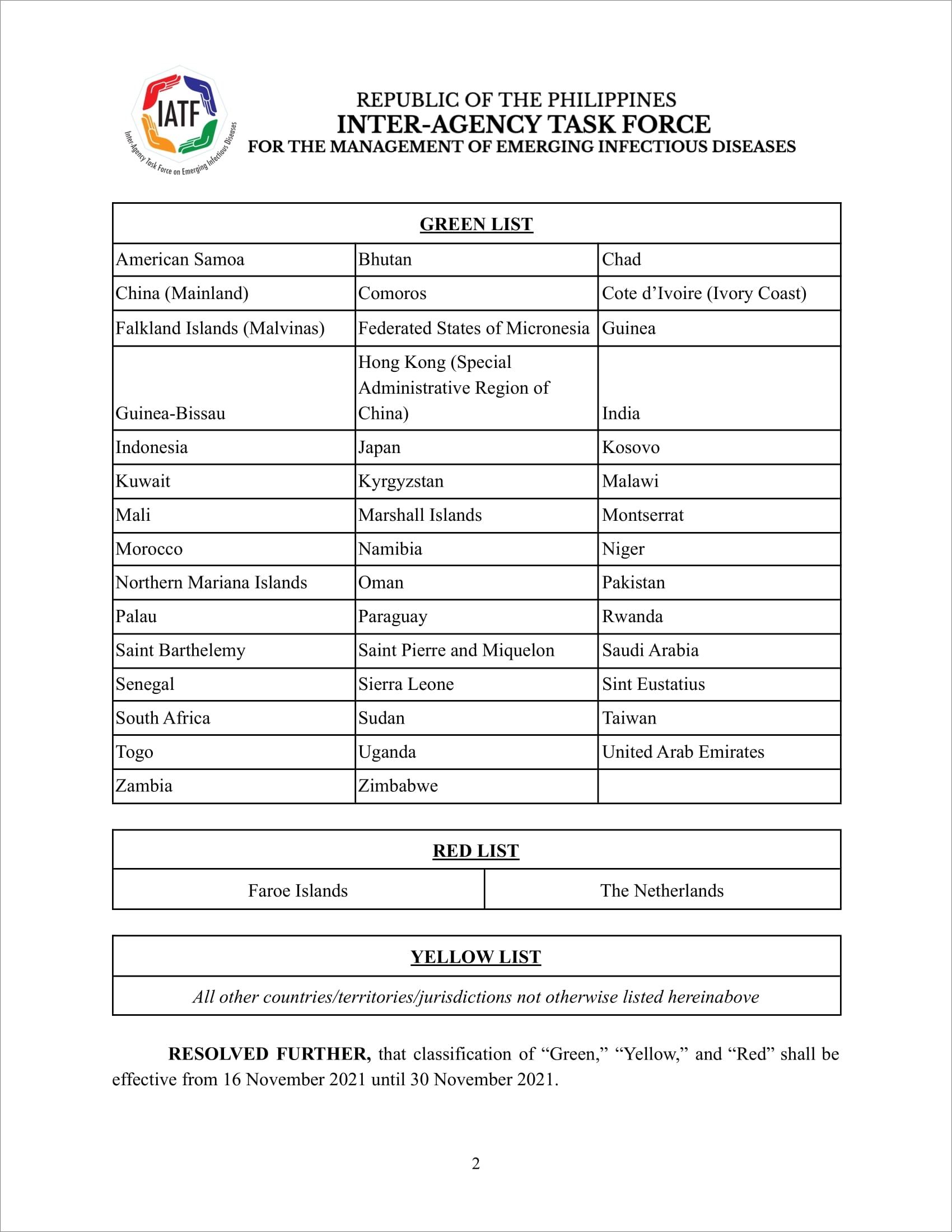 필리핀 IATFF(Inter-Agency Task Force)에서 고·중·저위험 국가 및 지역 목록을 새로 발표했다. 외국인의 입국이 금지되는고위험 국가/지역(적색국가)는 두 곳으로 패로제도(Faroe Islands)와 네덜란드(Netherlands)가 해당된다. 저위험 국가/지역(그린국가)는 44개국으로 그린국가에서 출발하는 여행자는 백신접종증명서와 출발 전 72시간 이내에 발급받은 음성확인서를 제출하면 입국 시 시설 격리를 면제받을 수 있다.