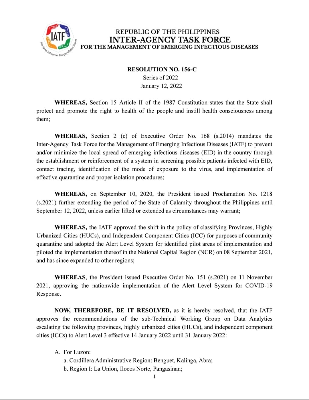 · Presidential Communications : IATF-EID Resolution No. 156-C