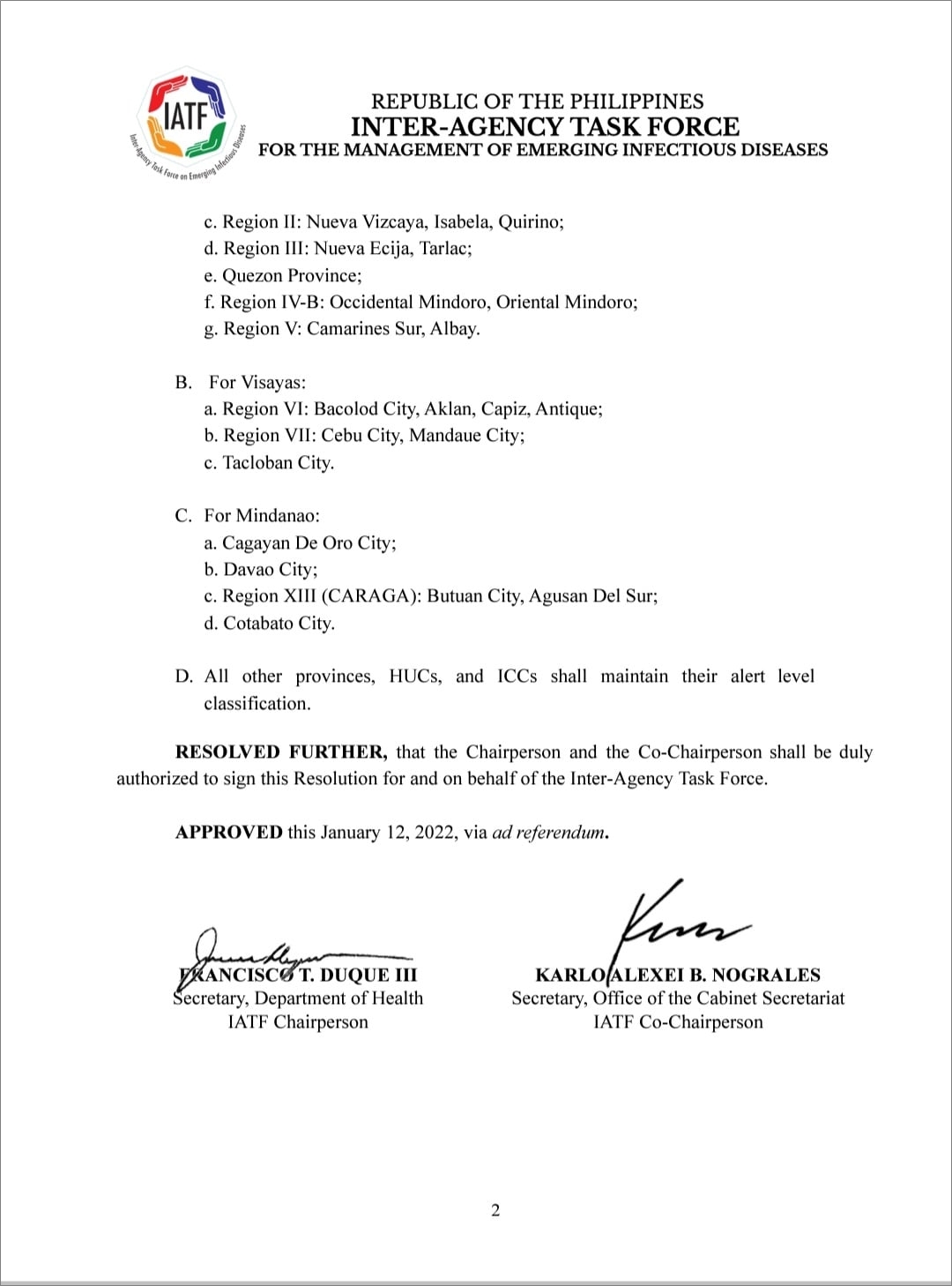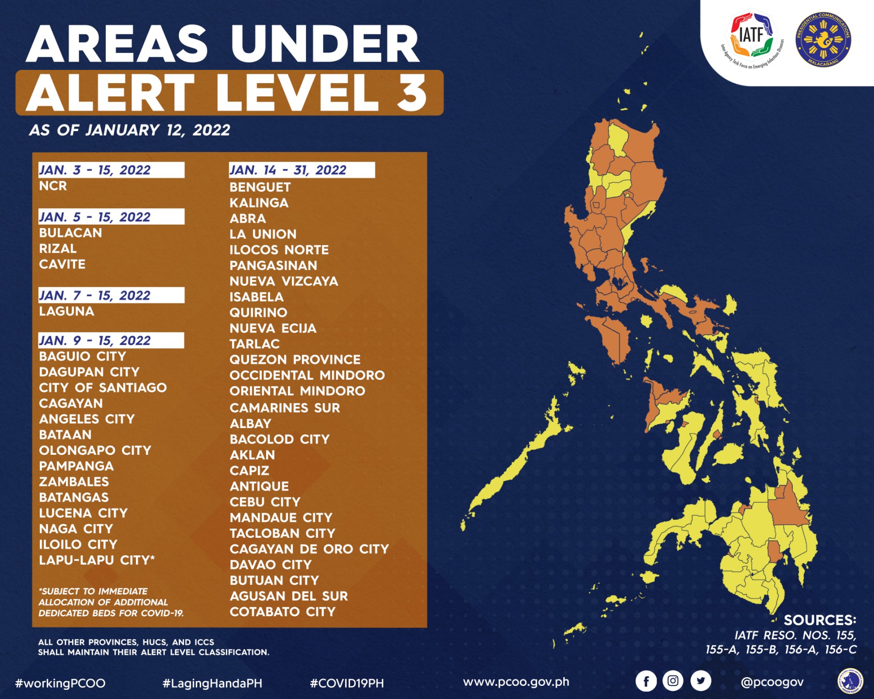 세부 시티, 바콜로드, 아클란 등 지역이 경고단계 3단계(Alert Level 3) 적용지역으로 분류될 예정이다. 백신접종자 수는 꾸준히 늘고 있지만, 오미크론 변이로 인해 코로나19가 빠르게 재확산하면서 일일 신규 확진자 수가 3만 명대로 치솟고 있는 상황이기 때문이다.