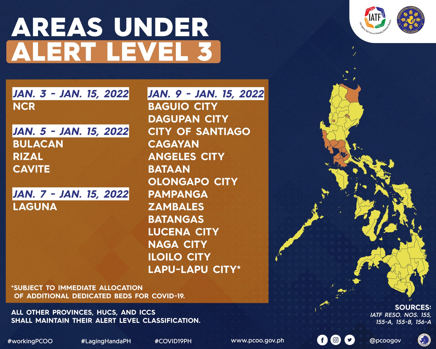 태스크포스 결의안(IATF-EID Resolution No. 156-A)에 따라 내일부터 바기오 시티와 앙헬레스 시티 등의 경보단계시스템이 경고단계 3단계(Alert Level 3)로 강화된다. 레벨3(Level 3)가 적용되는 지역은 아래와 같다.