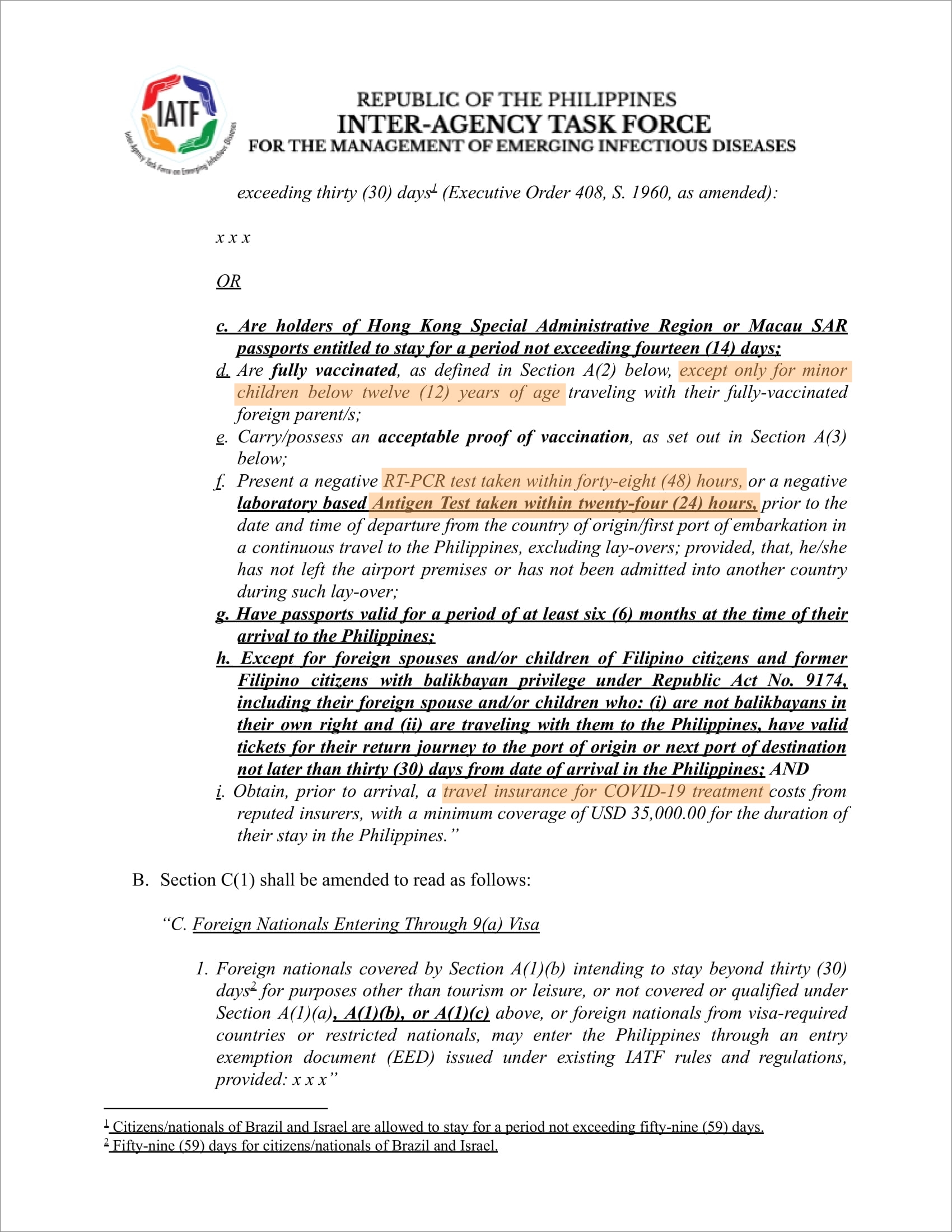 2. 9(a) 비자 : 9(a) 비자를 통해 관광 이외의 목적으로 30일 이상 체류하고자 하는 외국인이나 무비자입국이 불가능한 외국인은 EED(entry exemption document)를 통해 필리핀에 입국할 수 있음. 9(a) 비자를 통해 입국하는 외국인도 외국인 무비자 입국 조건을 지켜야 함.