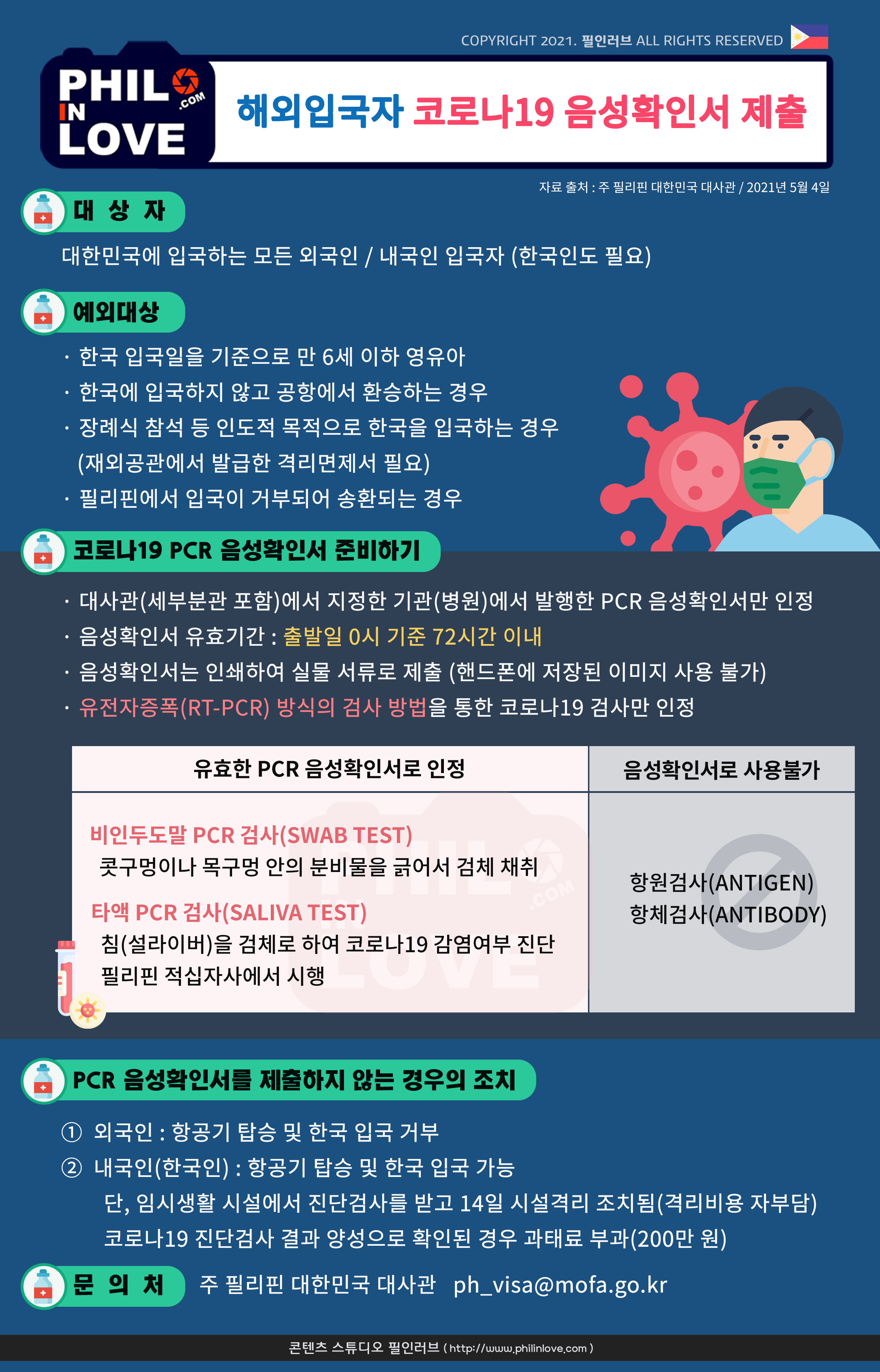 · 주 필리핀 대한민국 대사관 : 해외 입국자 PCR 음성확인서 제출 관련 종합 안내(5.4 수정)