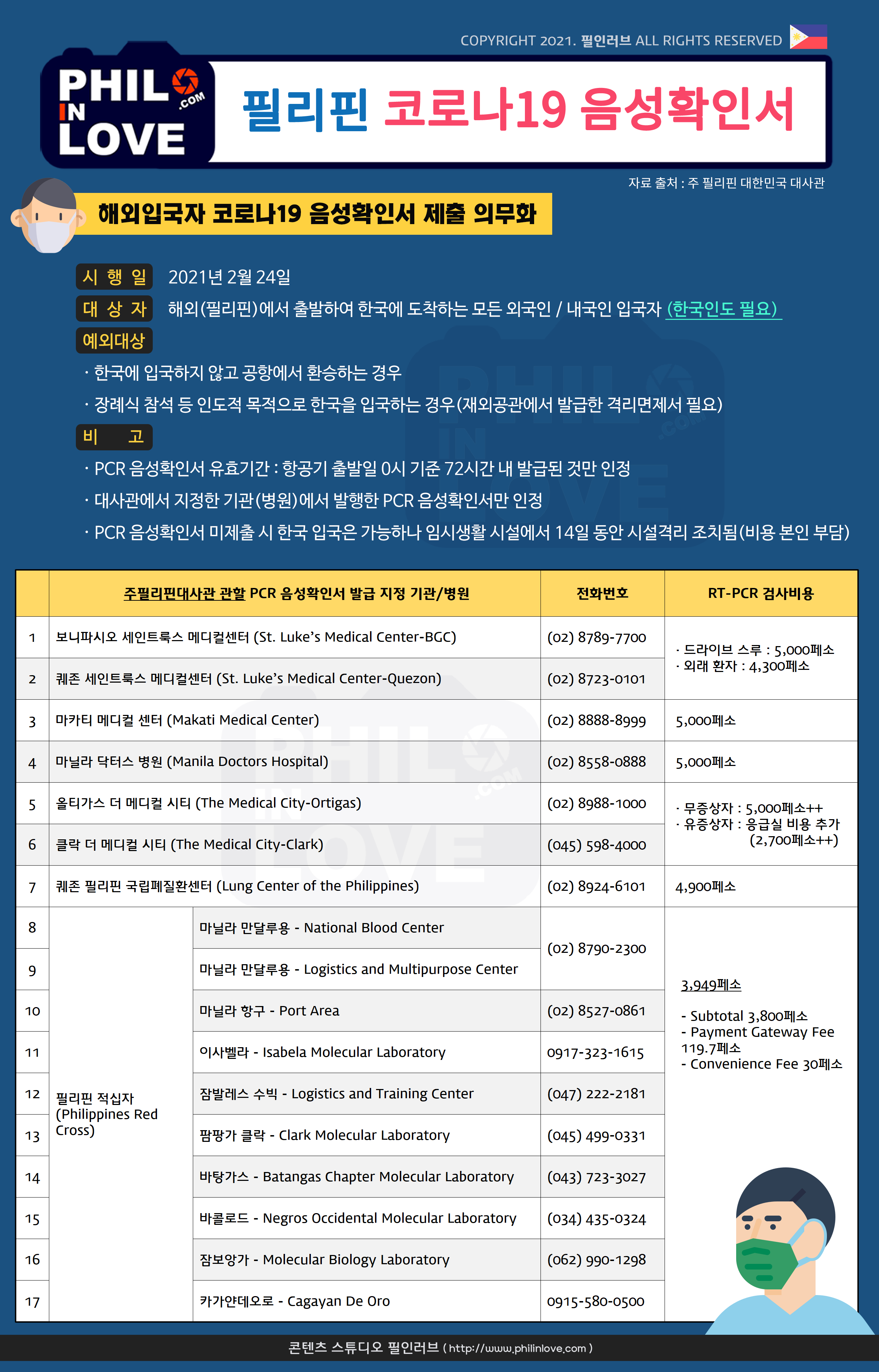 + 관련 글 보기 : [주 필리핀 대한민국 대사관] PCR 음성확인서 발급 지정 병원 코로나19 검사비 비교