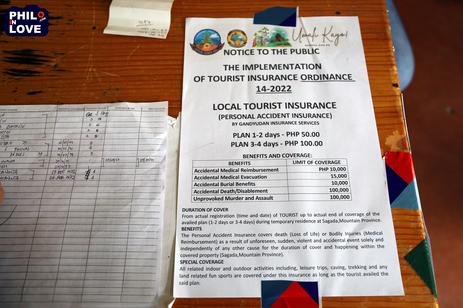 참, 사가다 여행을 하려면 관광사무소에 들려 50페소의 환경세를 내야만 한다. 환경세 내는 곳 바로 옆에 여행자보험 관련 안내데스크가 있어서 필수로 가입해야 하는 것처럼 보이지만 여행자보험 가입은 필수가 아니다.
