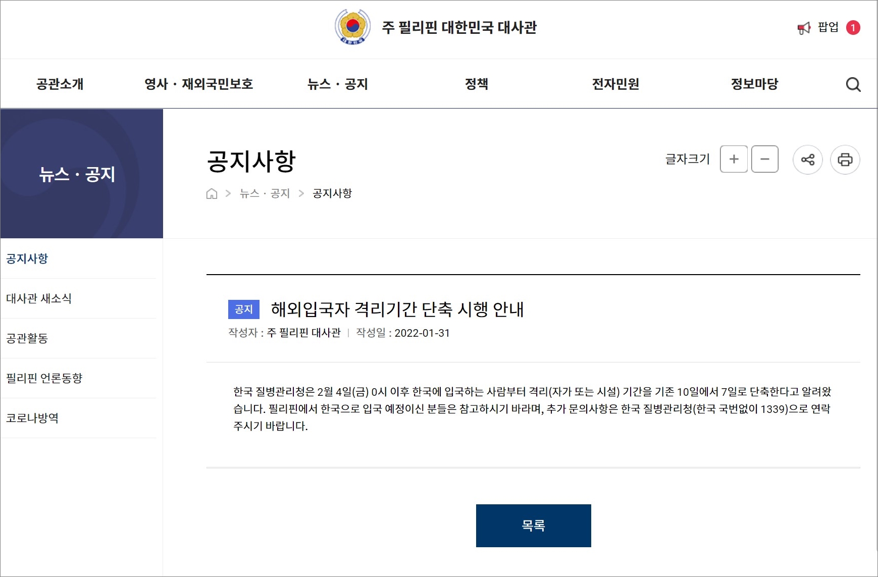 · 주 필리핀 대한민국 대사관 : 해외입국자 격리기간 단축 시행 안내