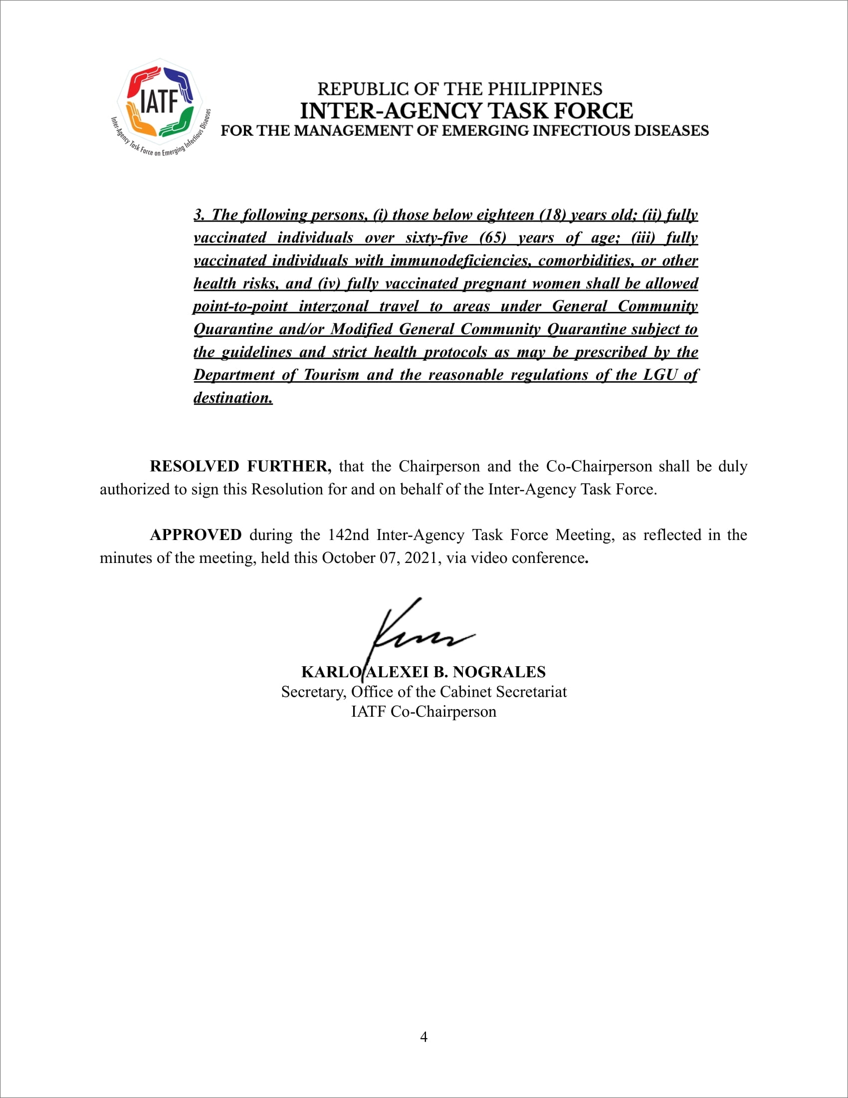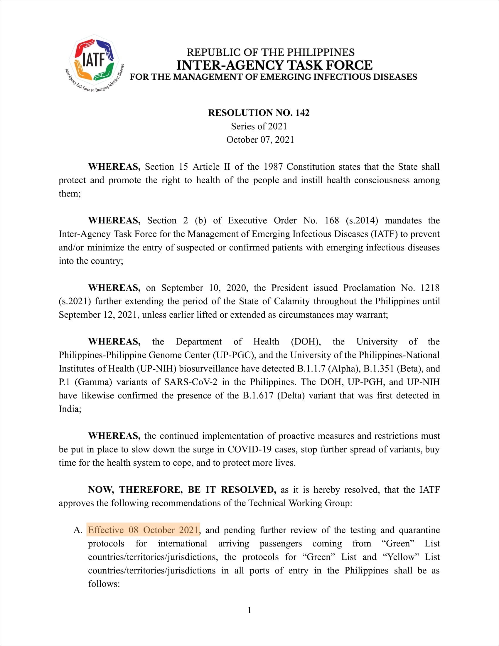 · Presidential Communications (Government of the Philippines) : IATF-EID Resolution No. 142
