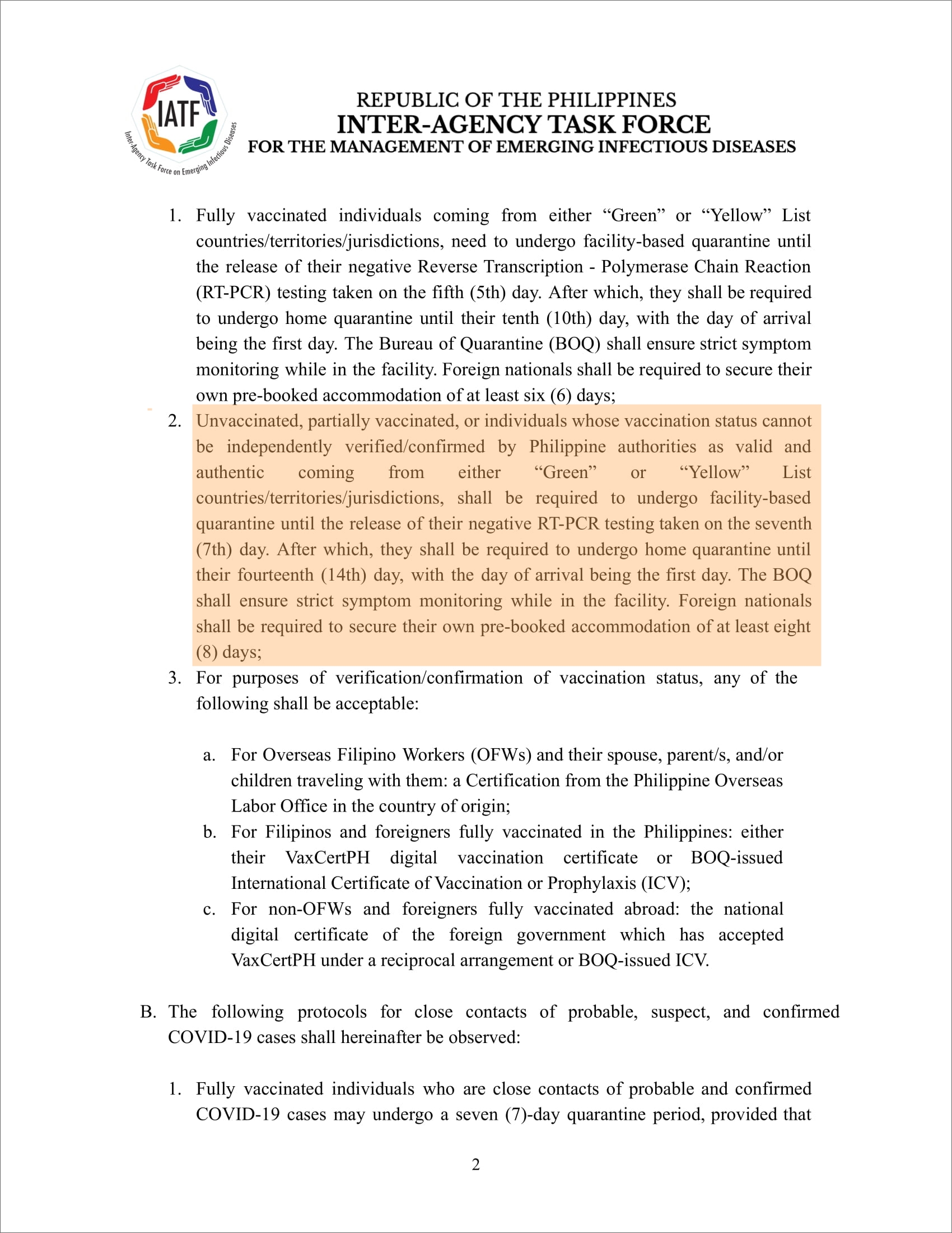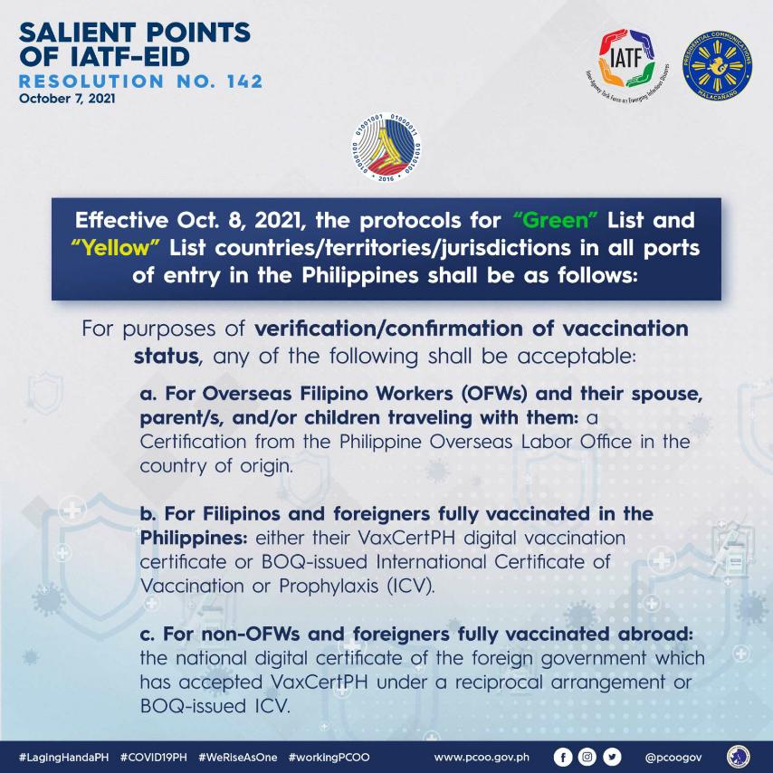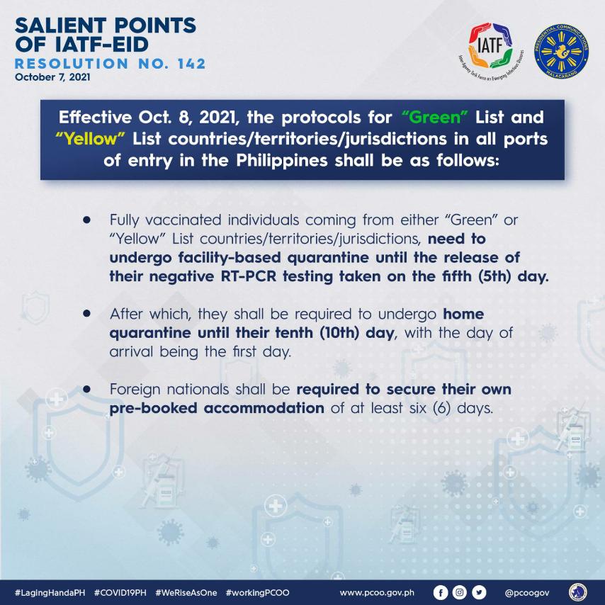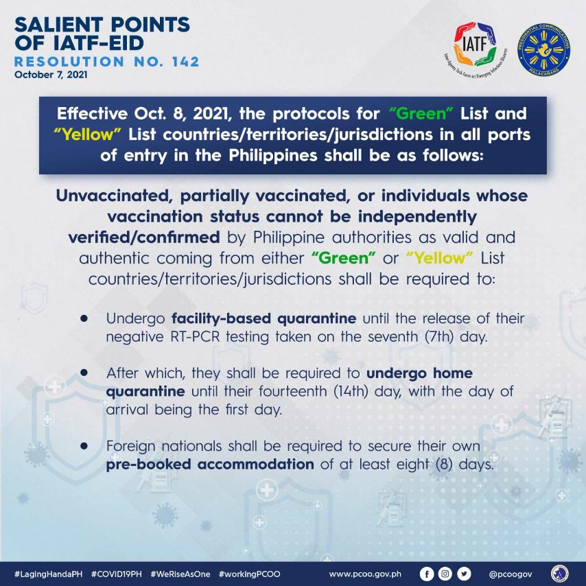 · Manila Bulletin : New COVID quarantine protocols for travelers from 'green', 'yellow' countries issued by IATF