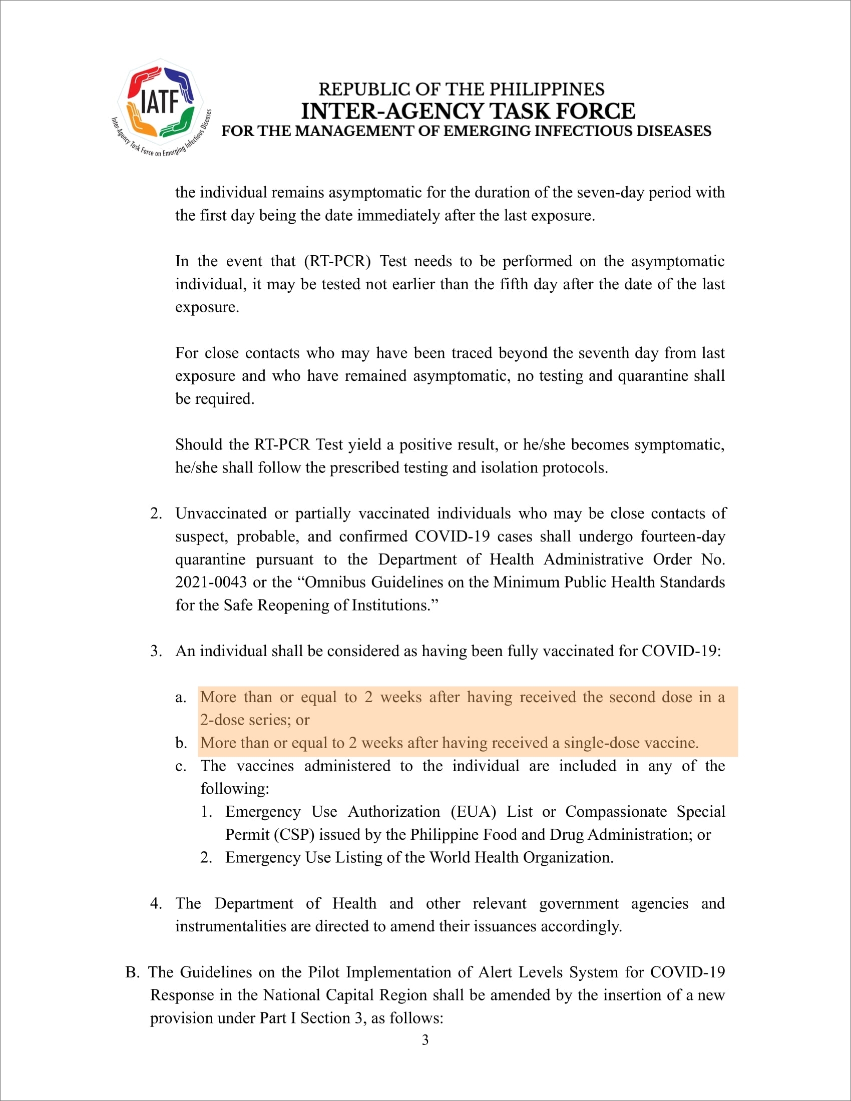 - 필리핀 식약청(FDA Philippines)이 긴급 사용 승인 또는 특별사용 허가를 내린 백신 또는 세계보건기구가 긴급사용승인을 내린 백신을 완전히 접종한 뒤 2주가 지난 경우